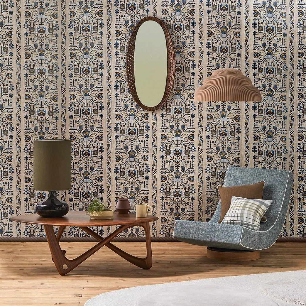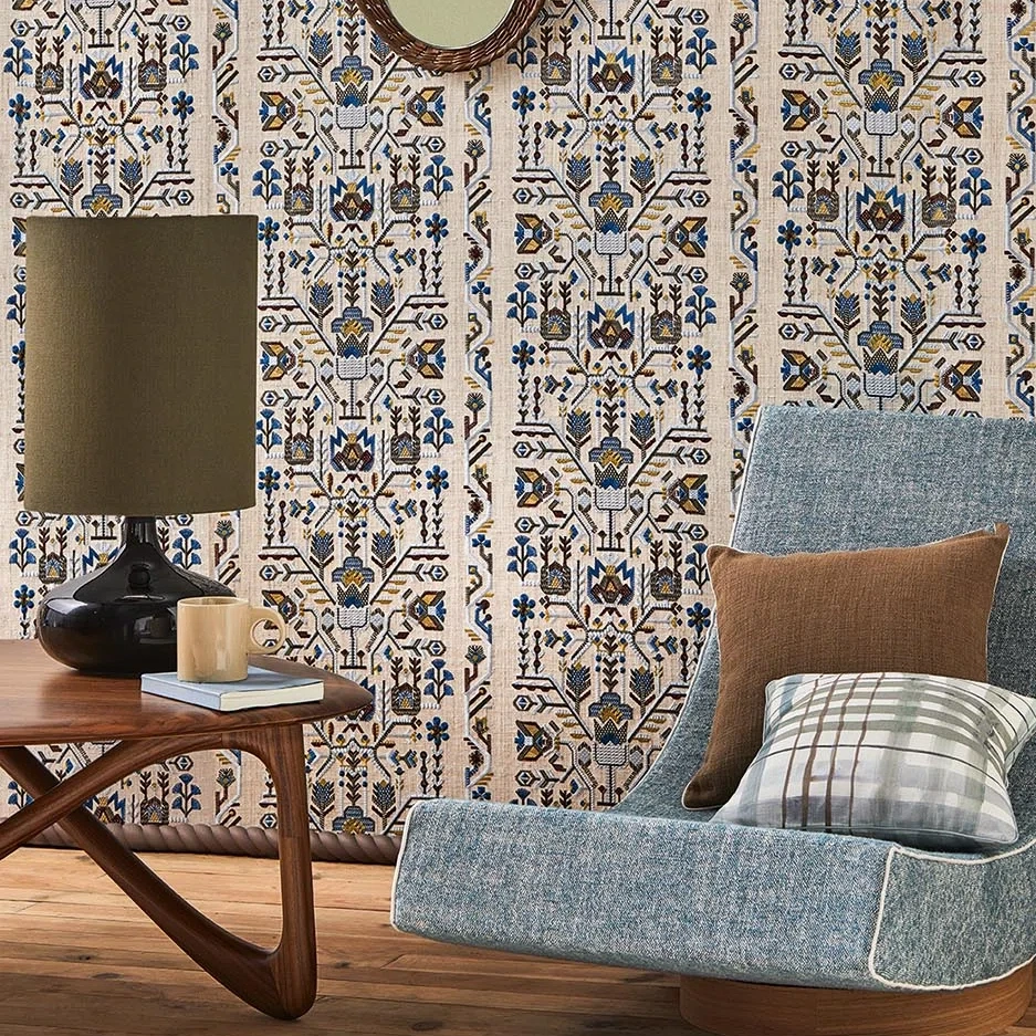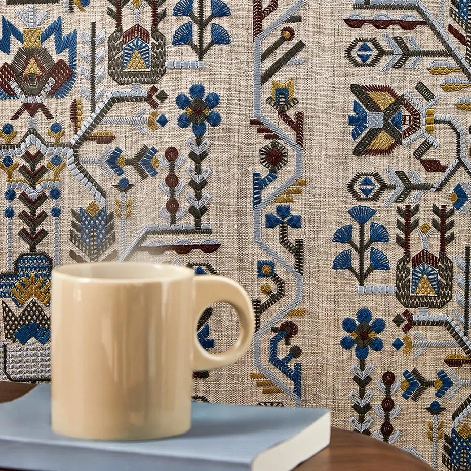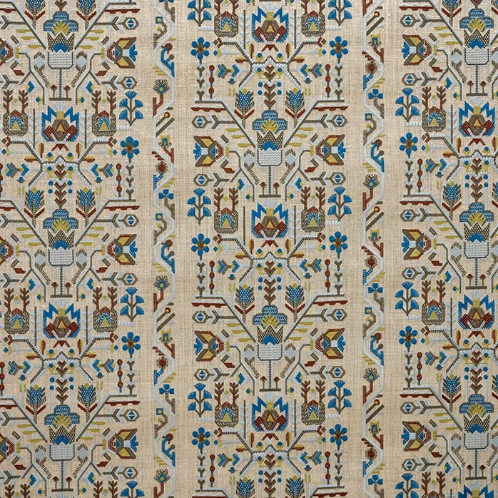 Inspired by painted Scandinavian woodwork, this design—crafted in the form of wide borders—is embroidered on a base composed primarily of silk.