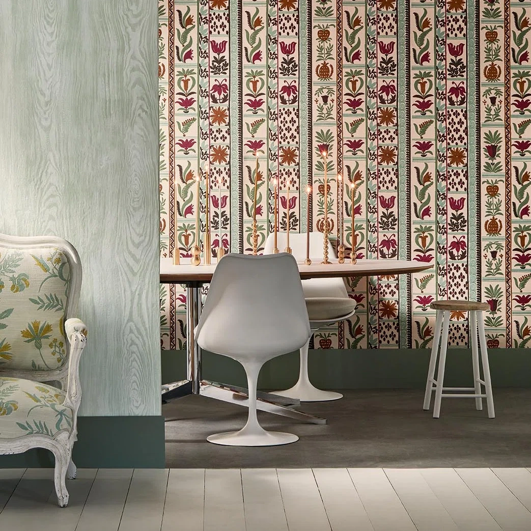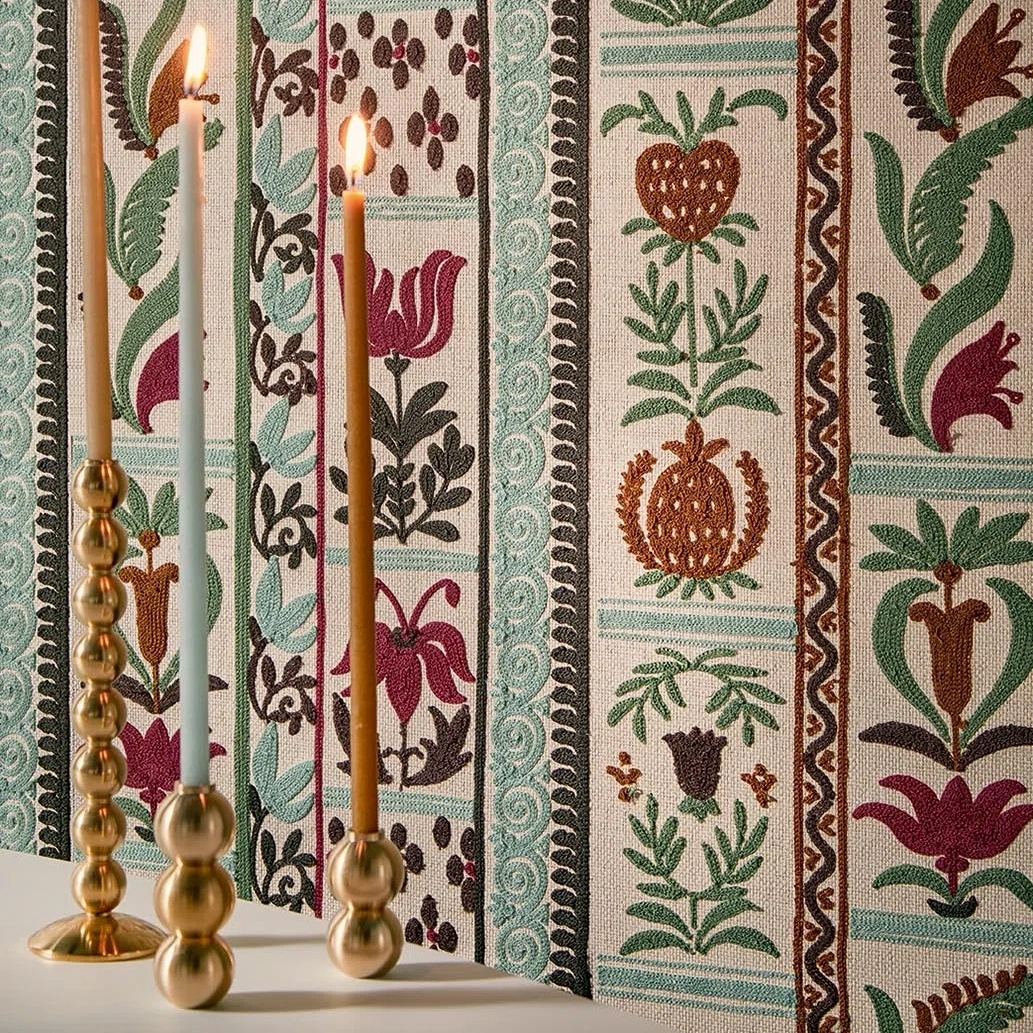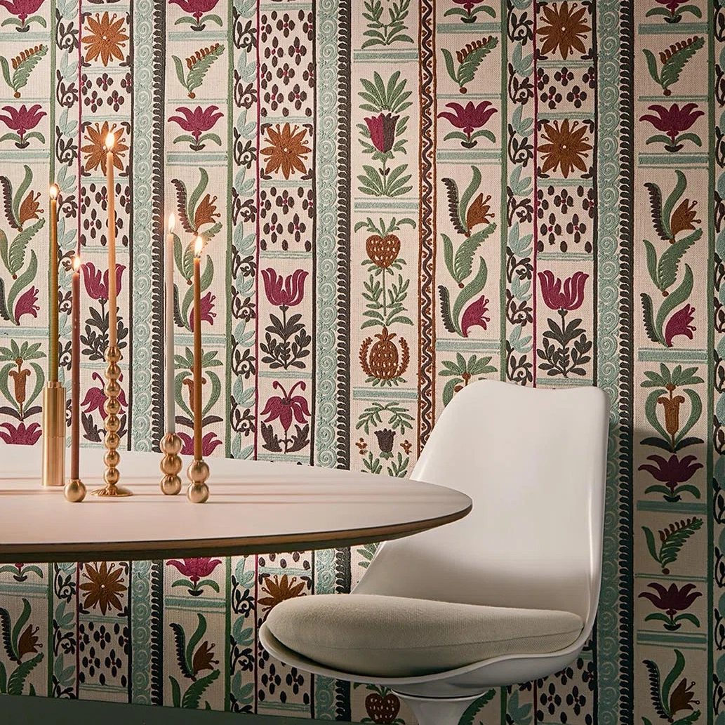 A design inspired by Scandinavian tradition and folklore. Crewel embroidery was chosen for this plant and arabesque motif. The thick, matte wool thread contributes to the handcrafted style of the wallcovering.