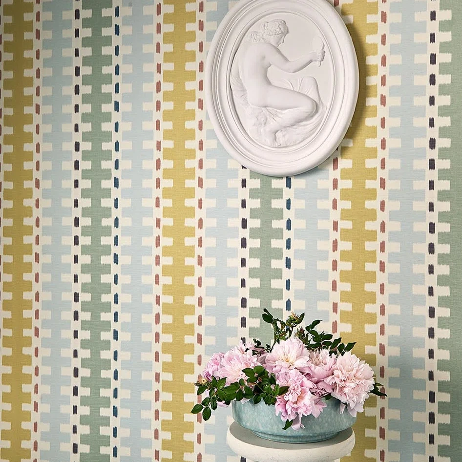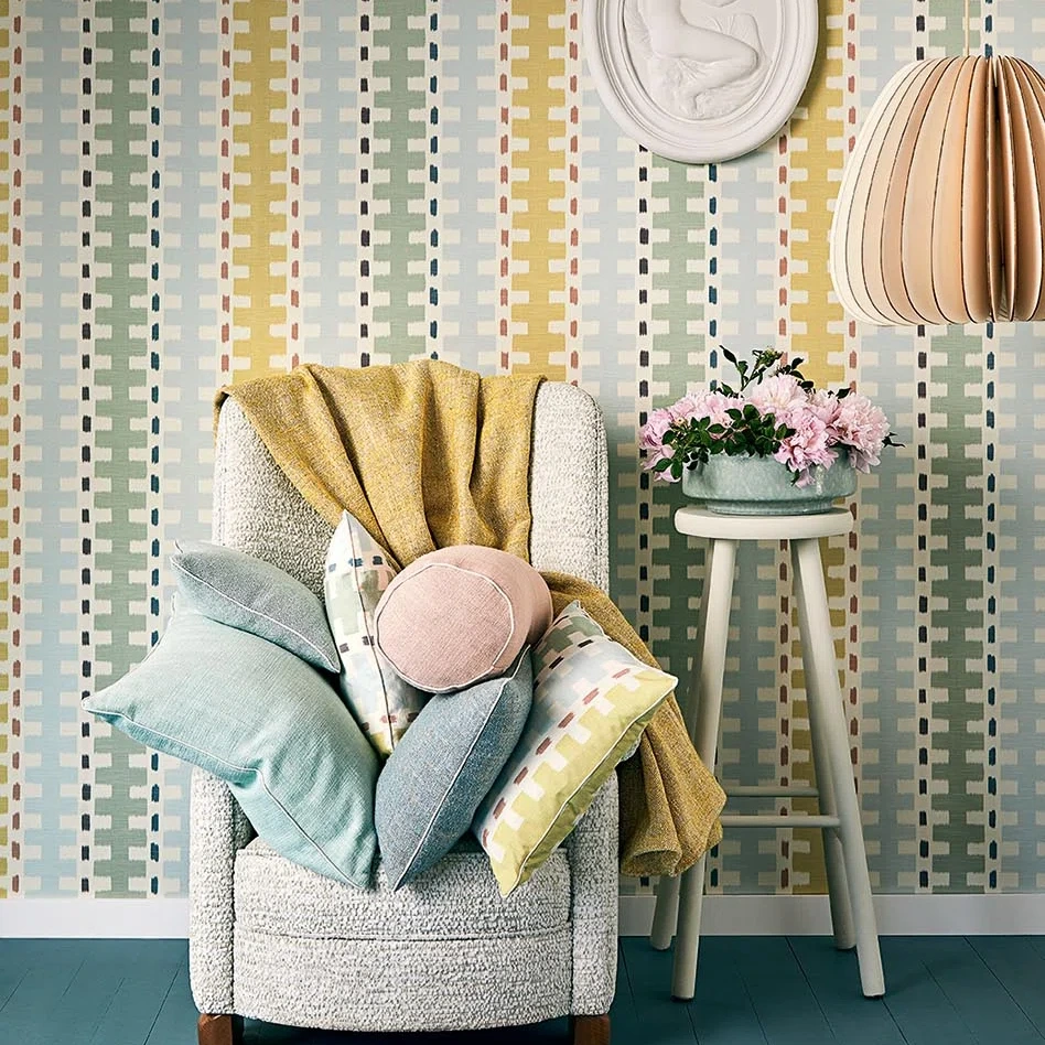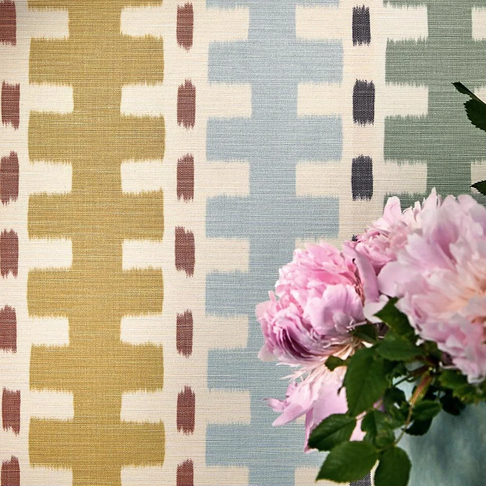A sumptuous warp print in a cheerful, colorful geometric pattern, laminated to apply to the wall. Gustaf coordinates perfectly with the fabric of the same name.