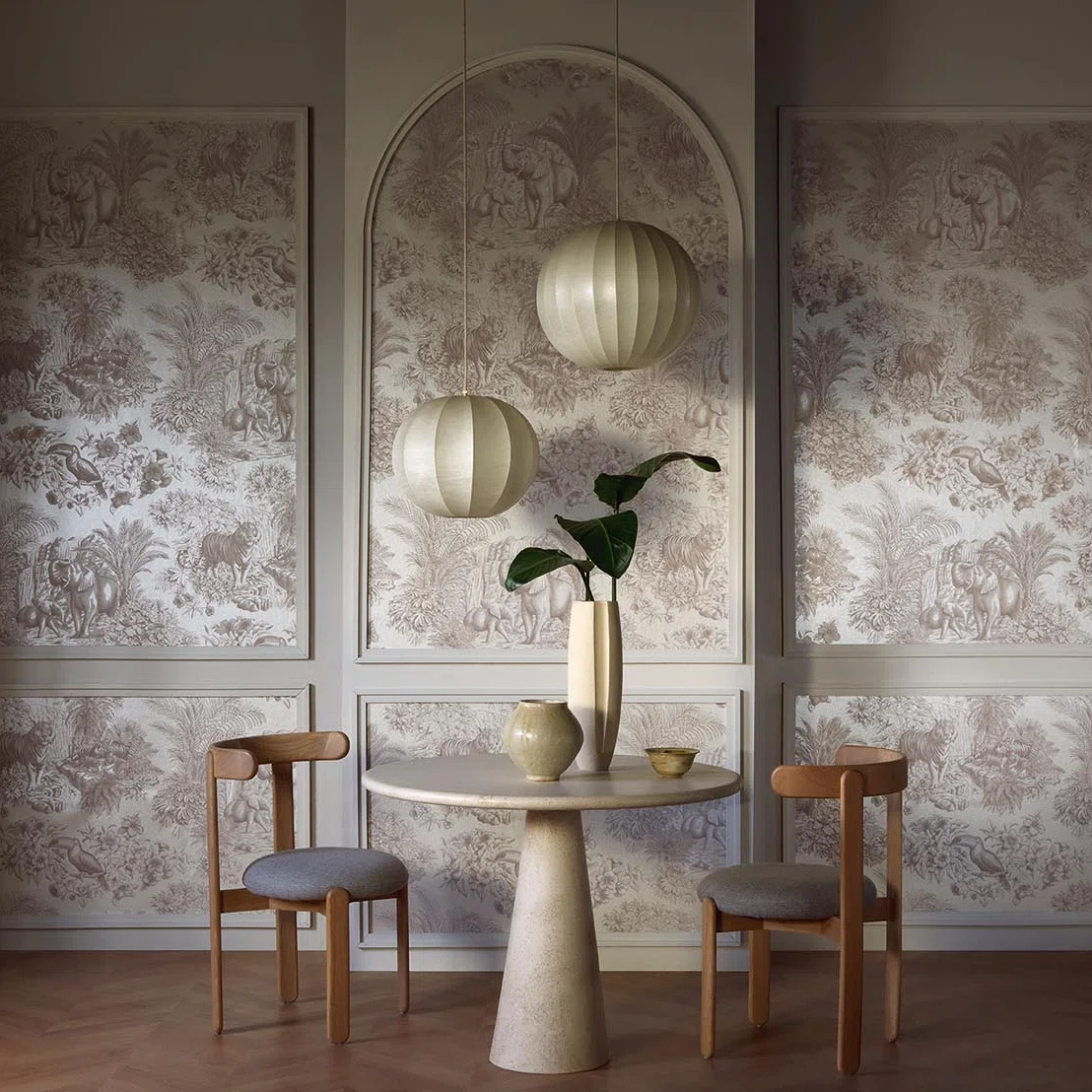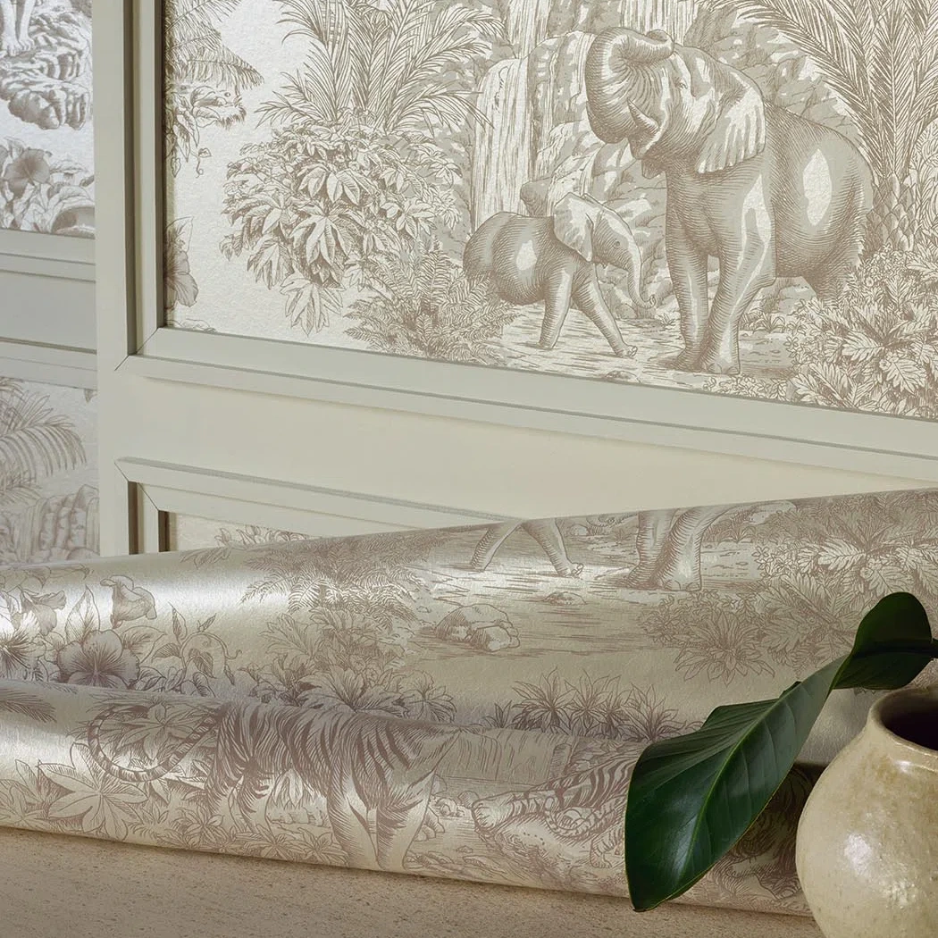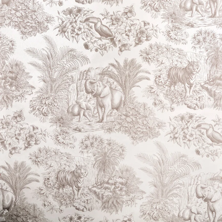 Like an animal toile de Jouy, the playful line-drawings printed on a pearl background delicately evoke the jungle and its animals.