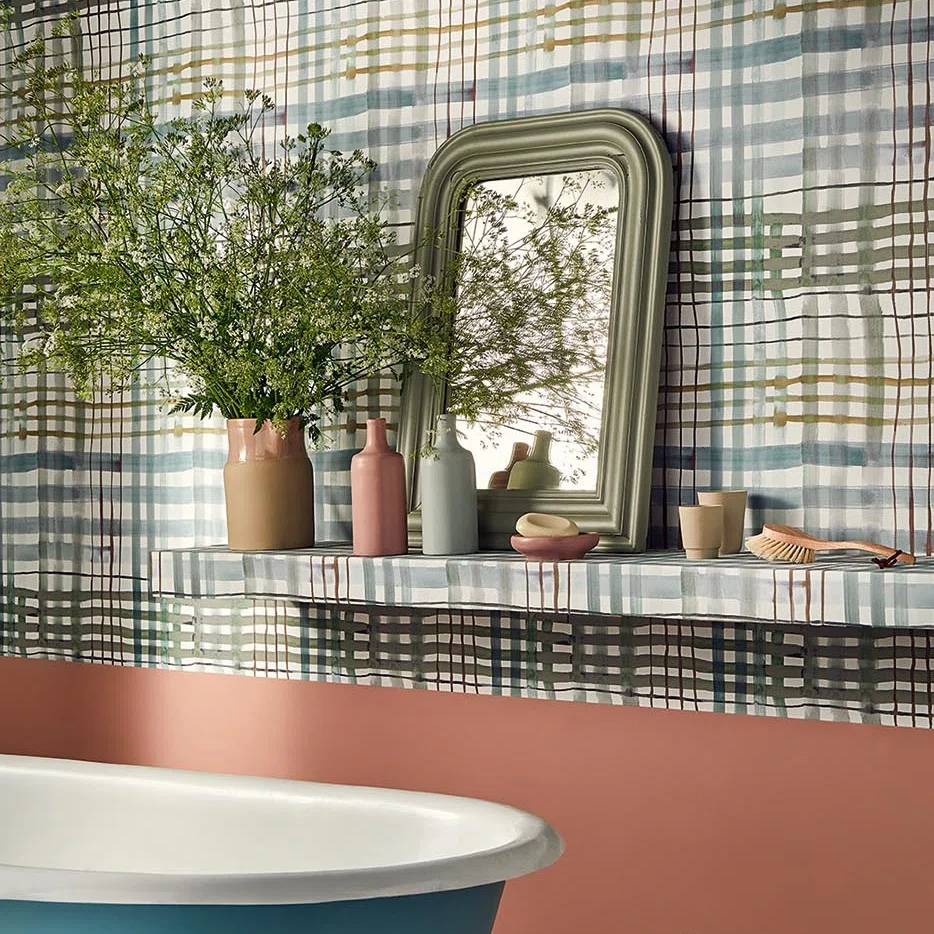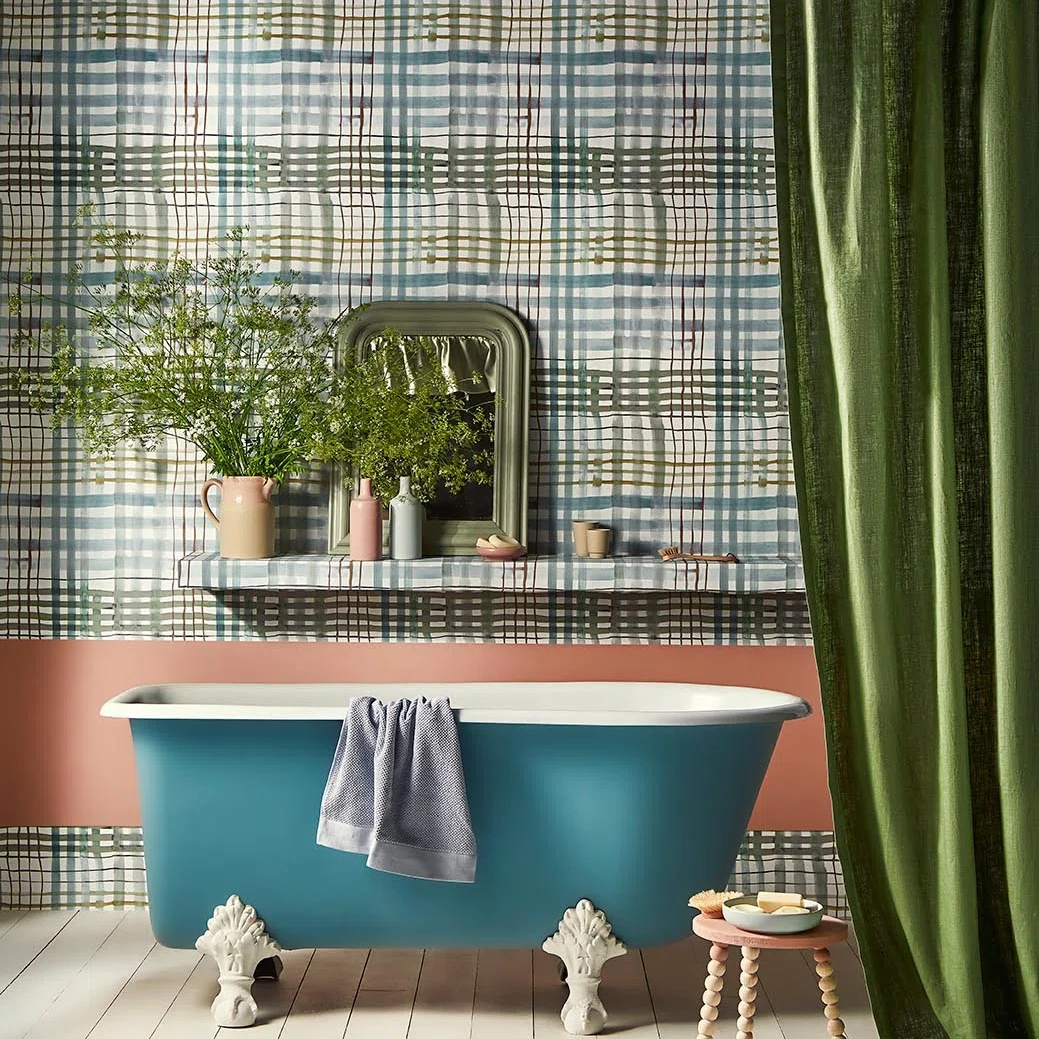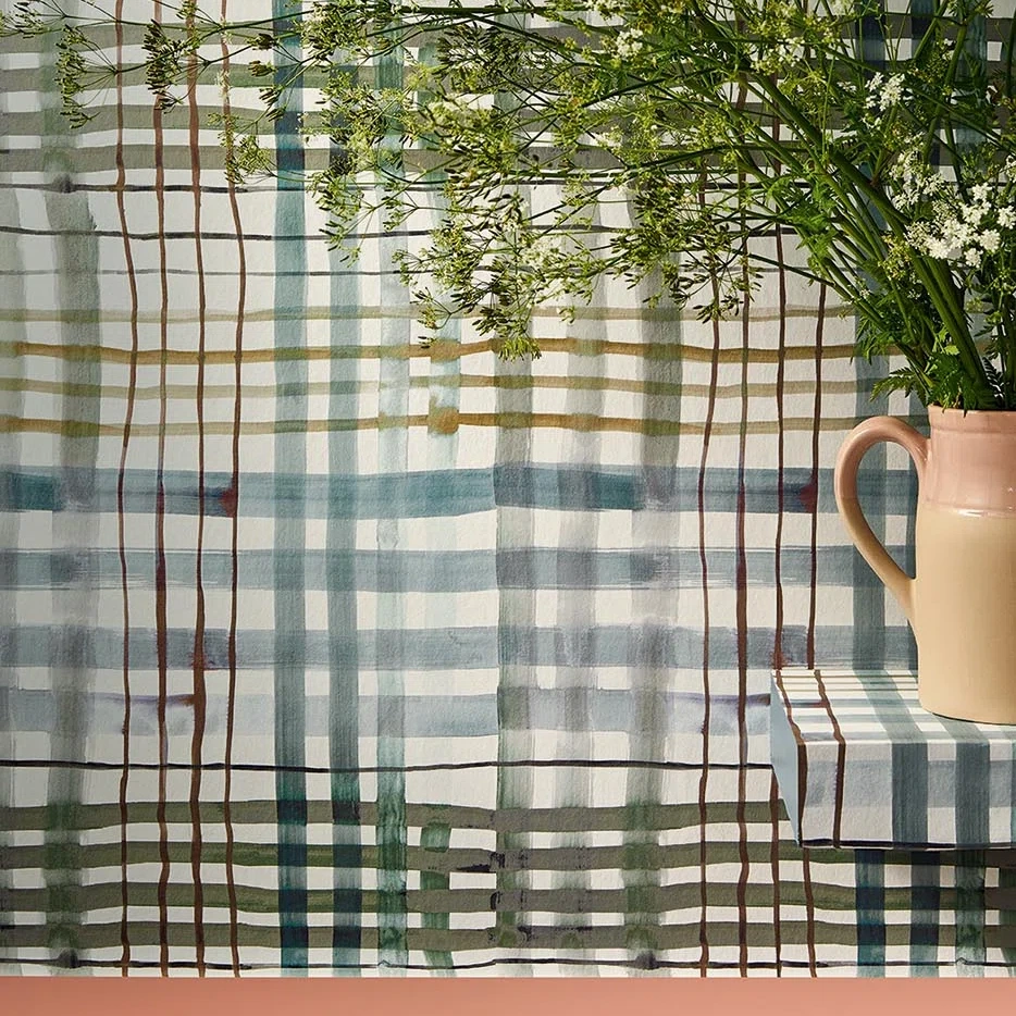 This large contemporary check is drawn with a random watercolor line. Midsommar means “midsummer”, when nature reaches its peak of fertility. It is inspired by a Swedish pagan festival.