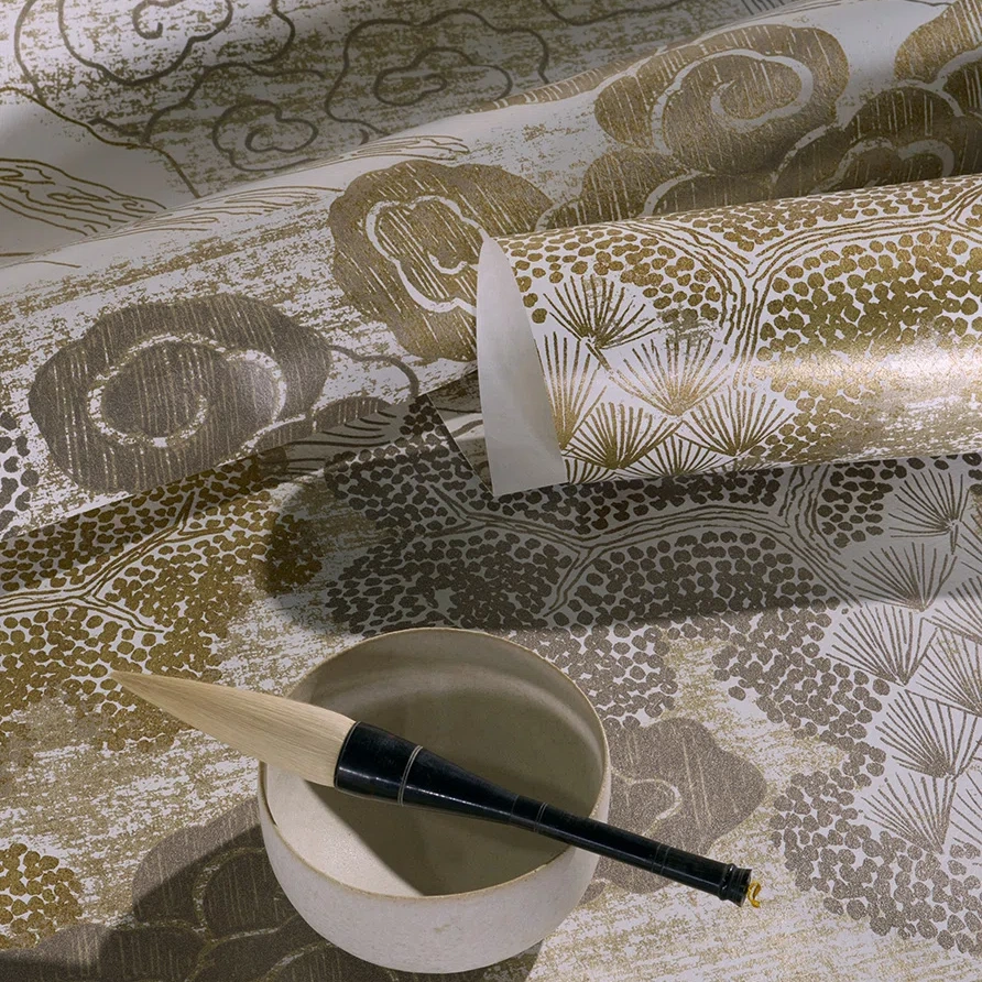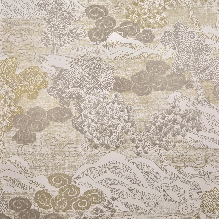 Drawn with felt-tip pens, this motif illustrates with modernity the landscapes of Mount Mitake in Japan. The white, gold and silver print on a pearly background reveals the magic of this XXL design.