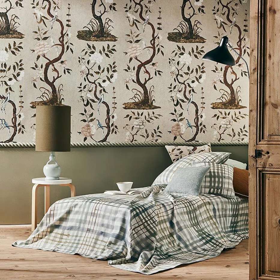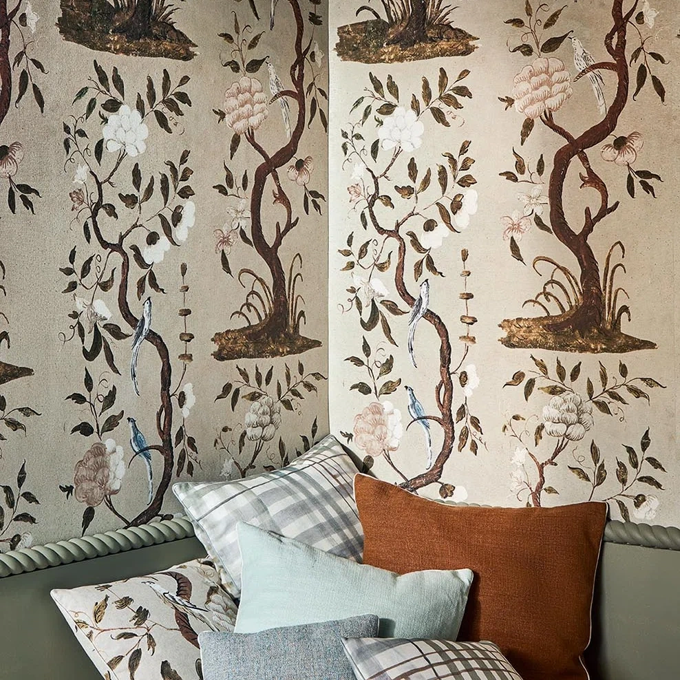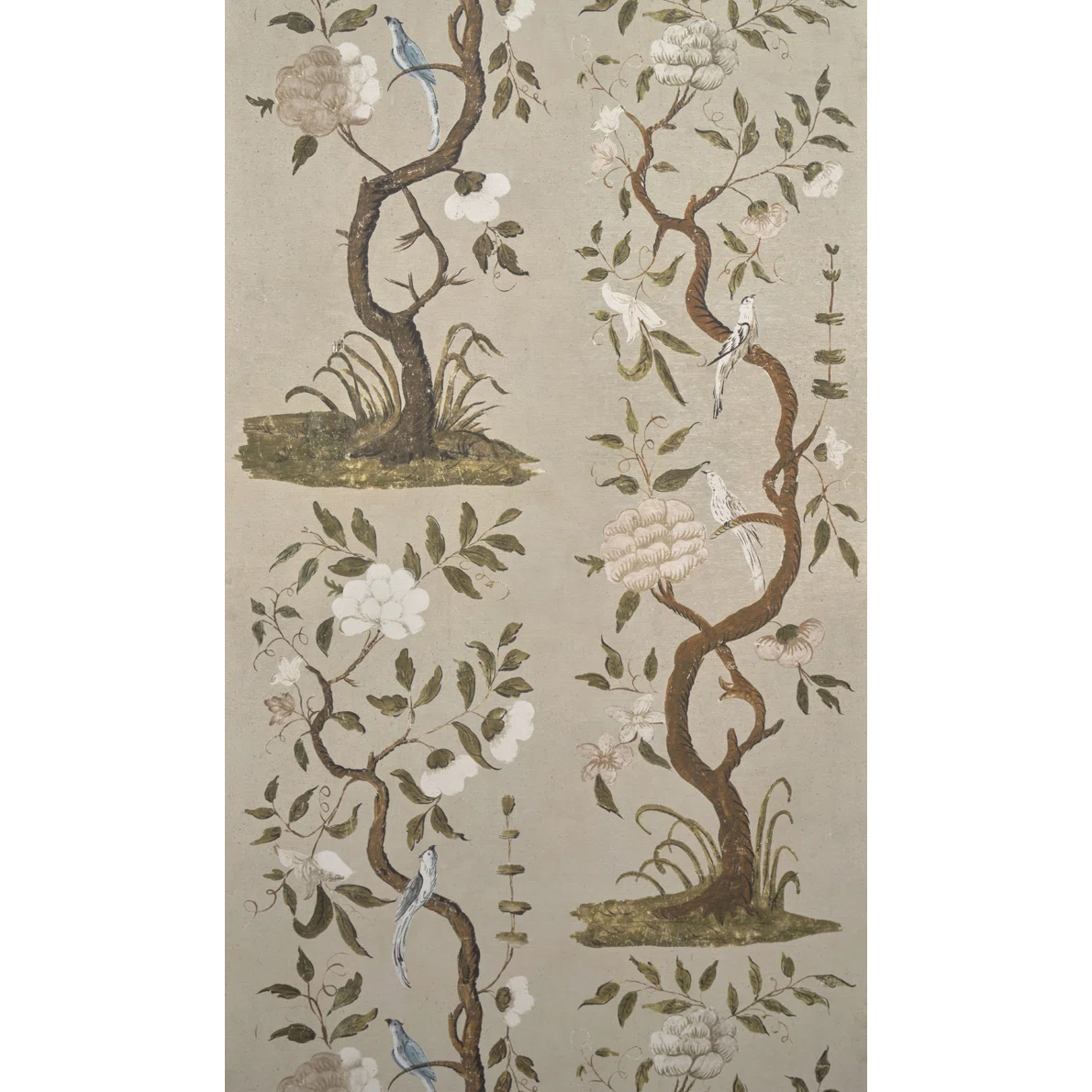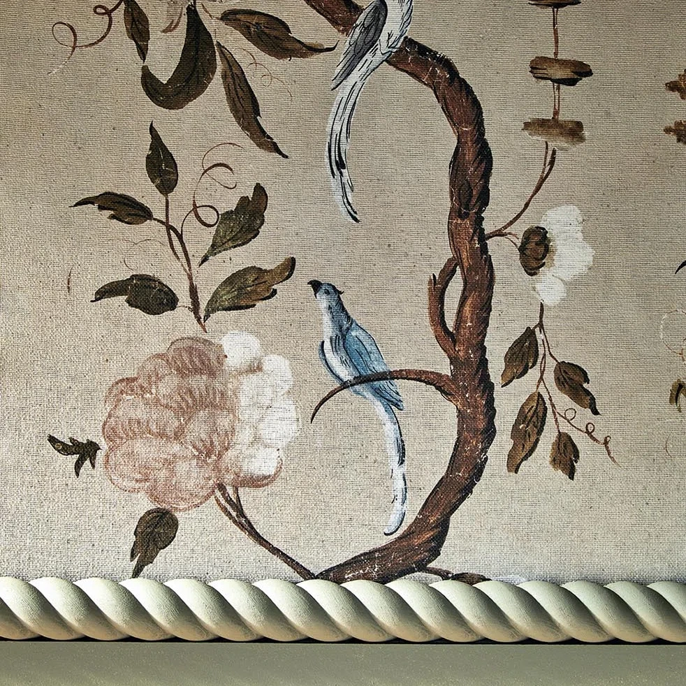 Discovered during a visit to Stockholm, this motif of bird-inhabited trees, printed and hand-painted on 18th-century planed paper, is a Swedish creation inspired by Chinese models imported at the time. Installed with flat-headed nails (“à la broquette”), It is still in place in the Swedish Drottningholms Slottsteater. Dating from the 18th century, this theater is adjacent to the Royal Palace, often called the Swedish Petit-Versailles.