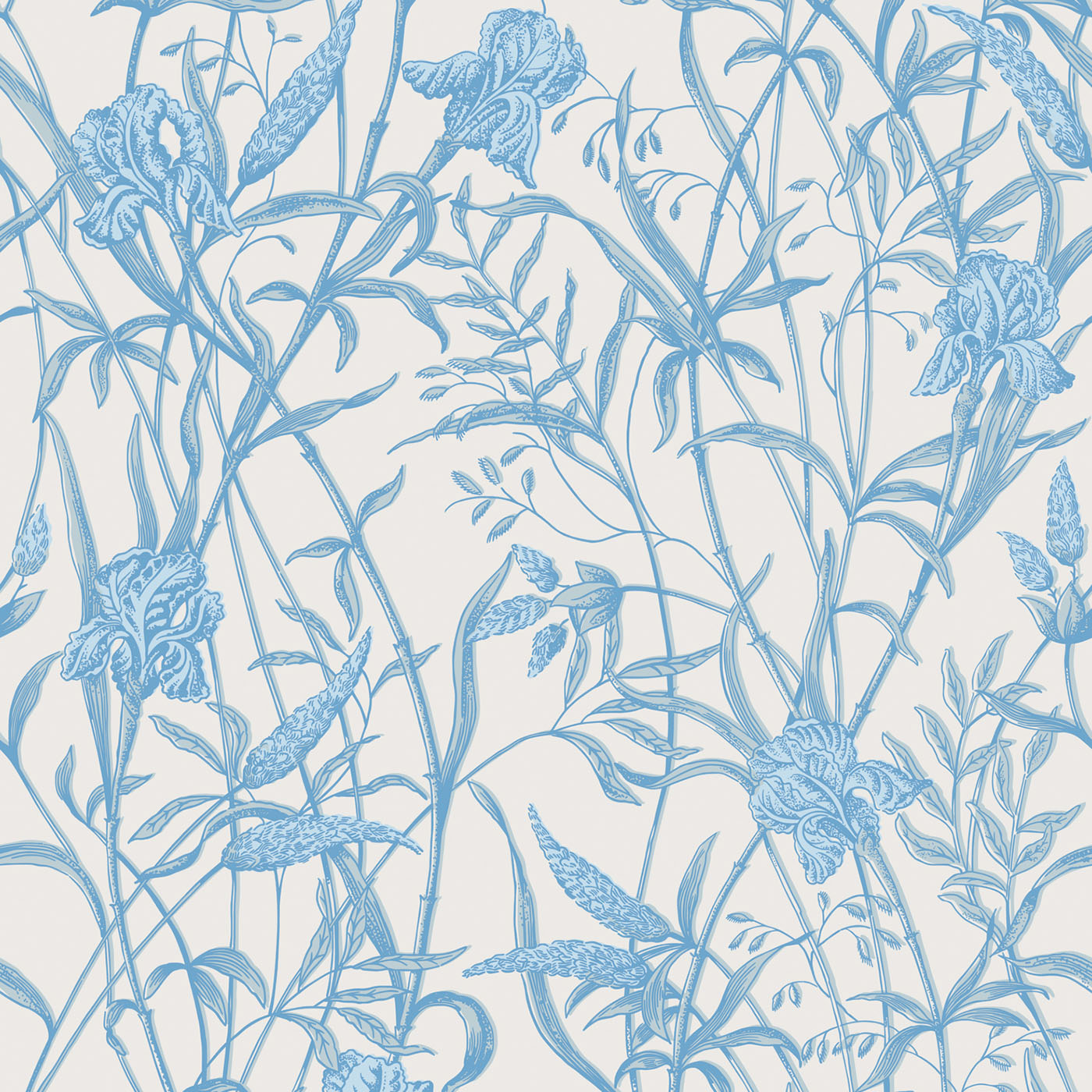 The leafy, detailed linework of Iris is typical of its once screen-printed production, with each layer being perfectly imperfect in its overlapping. The flower’s unique shape and immersive leaf repeat creates a full and lush wallcovering.