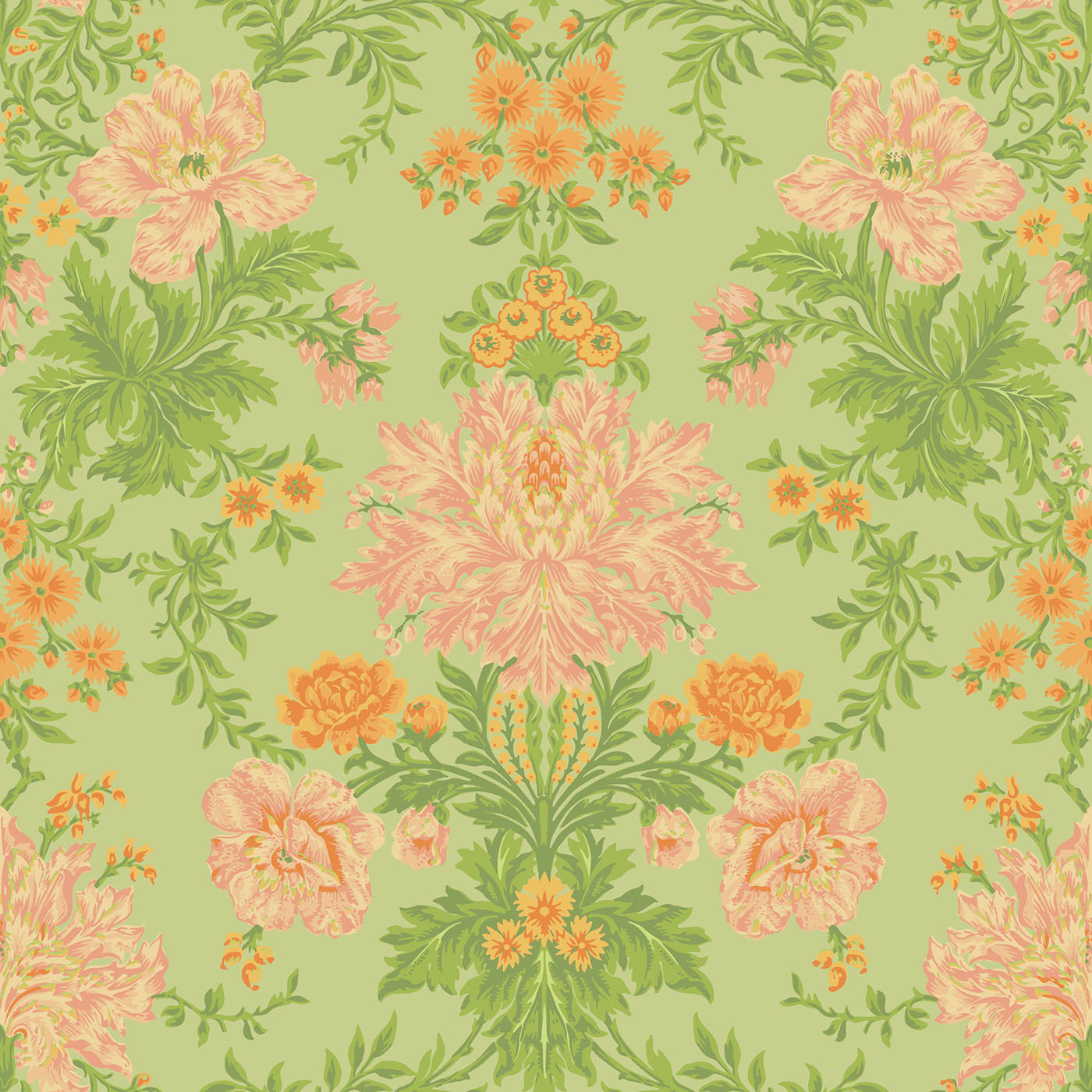 Blousy and charming, Poppies’ vintage print of blooming florals and ruffled dissected leaves creates a regal damask.