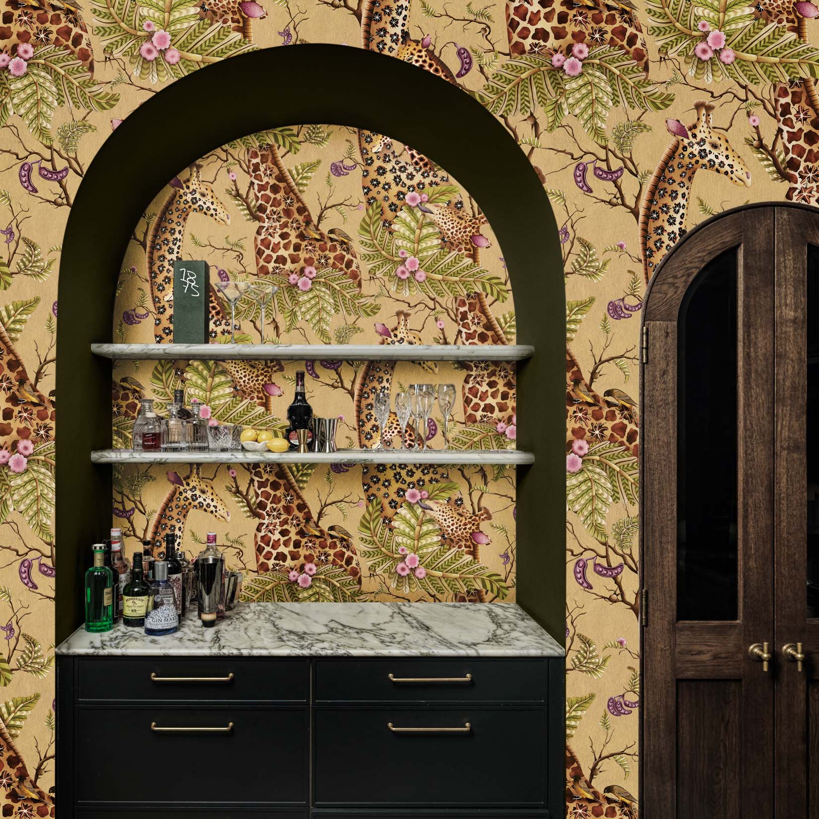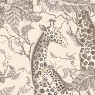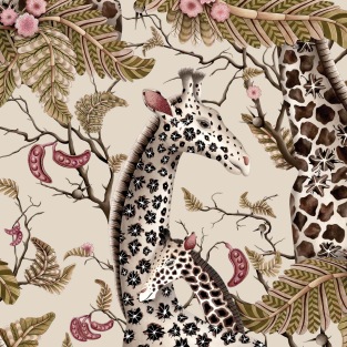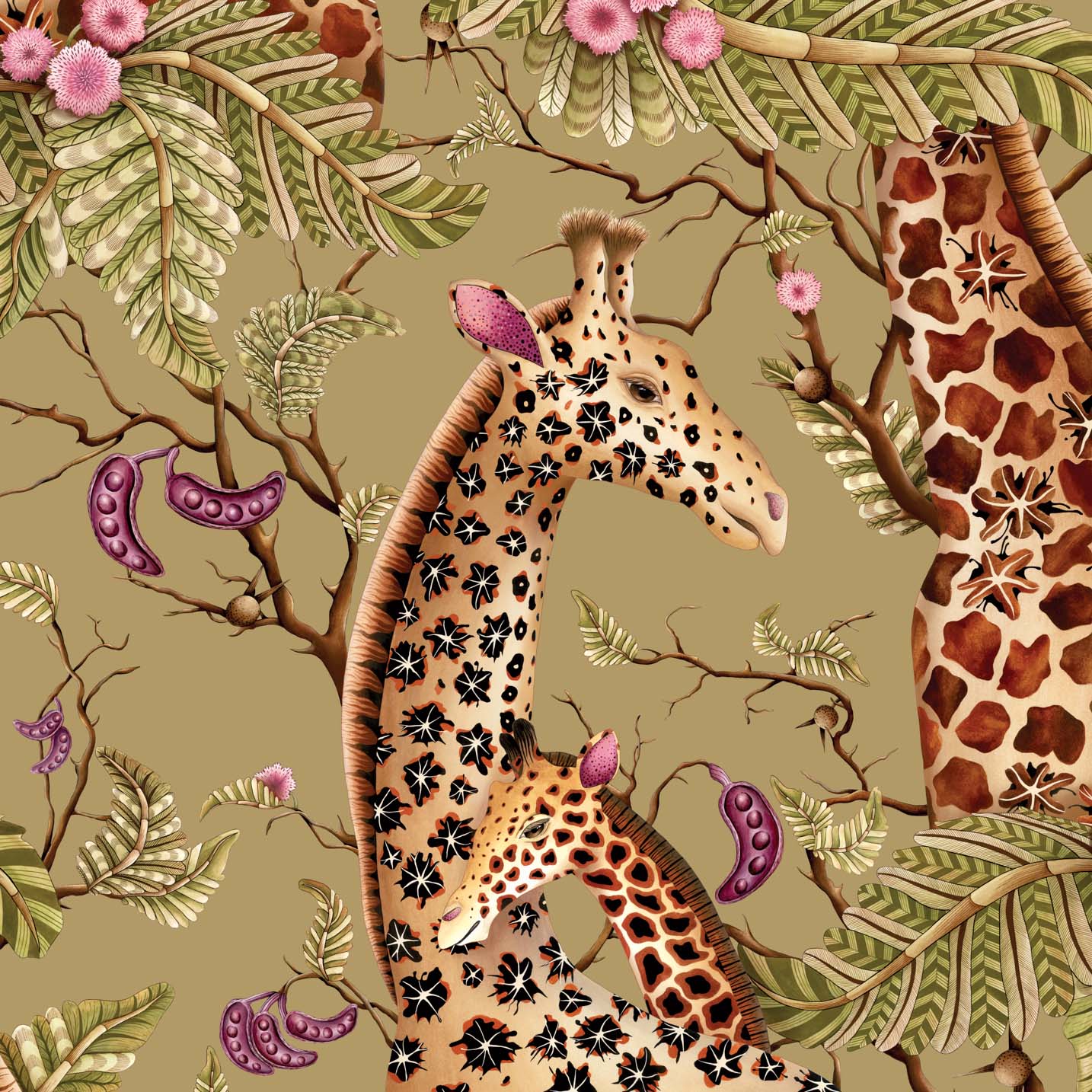 Royal Giraffe is a captivating design of maternal love. Capturing a fleeting moment of two regal giraffes, a child turns towards her mother’s embrace as they stand amongst the highly decorative acacia leaves and bean pods around them. A serenity exists within the elegance of these majestic, towering creatures.