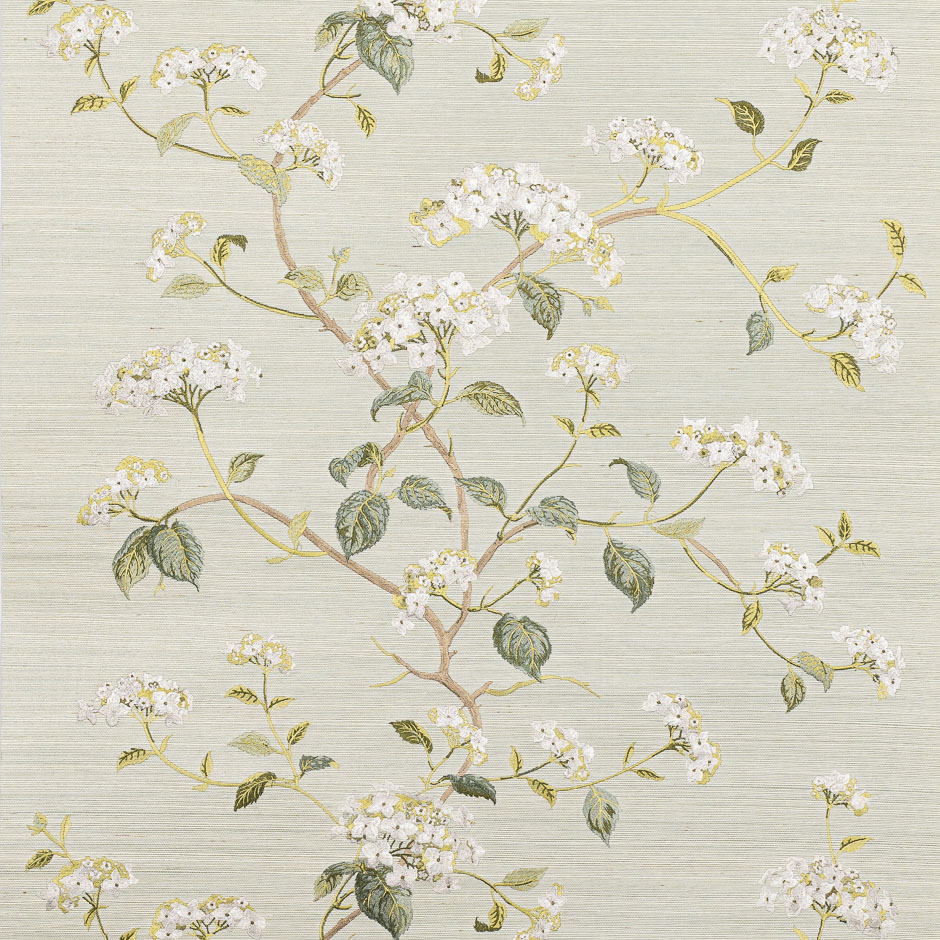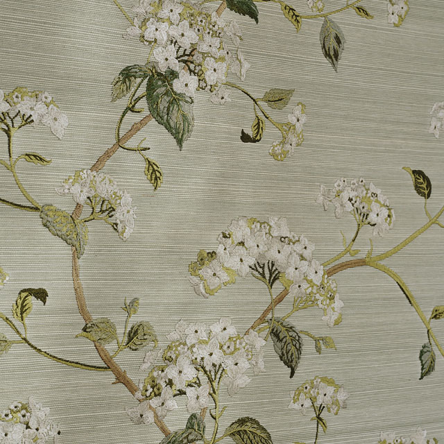 Expertly expressing the beauty and artisan nature of Colefax and Fowler embroideries on a luxurious sisal wallcovering. Blooming hydrangeas—an iconic feature of English country gardens—are rendered in intricate, delicate stitchwork. The interplay between the refined embroidery and the dry, textured surface of the sisal creates a wallcovering of remarkable quality and artistry.