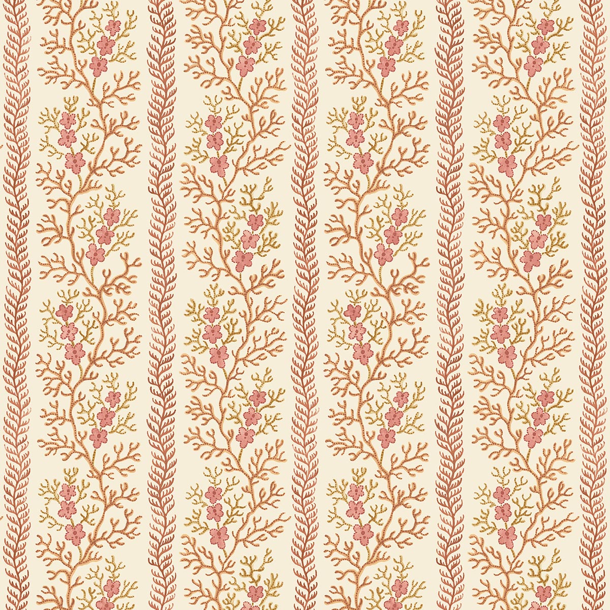 Charmingly informal just like its namesake, ‘Symington’ features a delicate leafy coral stripe adorned with pretty miniature flowers. Taken from a small watercolour design which is dated from 1760-1790, the design would have been used to print onto lightweight cotton or muslin for ladies clothes.