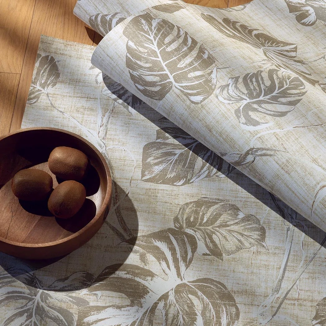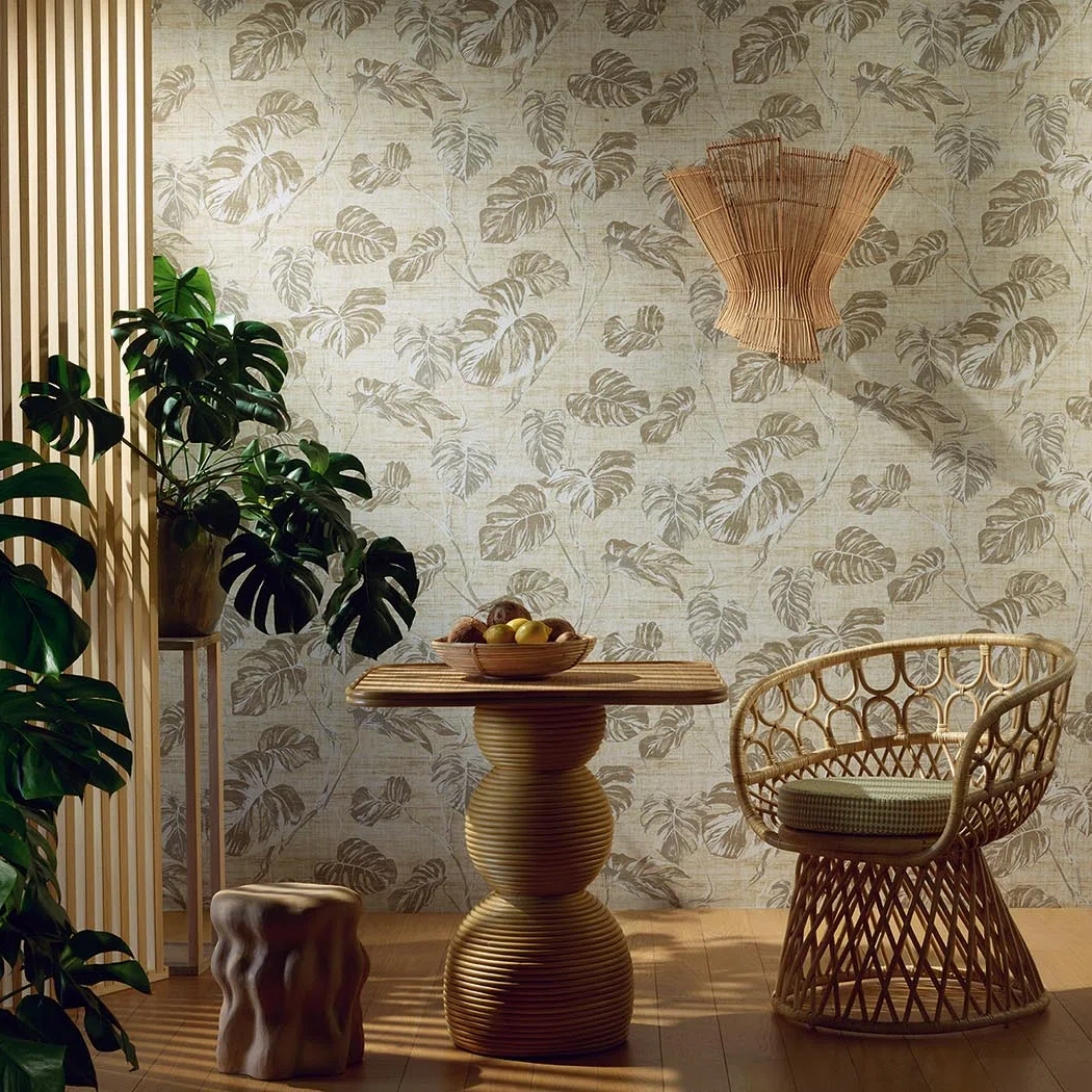 Inspired by a gouache by Germaine Midy, created in the Pierre Frey studio in 1951 and kept in the Maison's archives, this vegetal motif of monstera leaves printed on matte non-woven gives rhythm to the wall, inviting you to take a change of scenery.