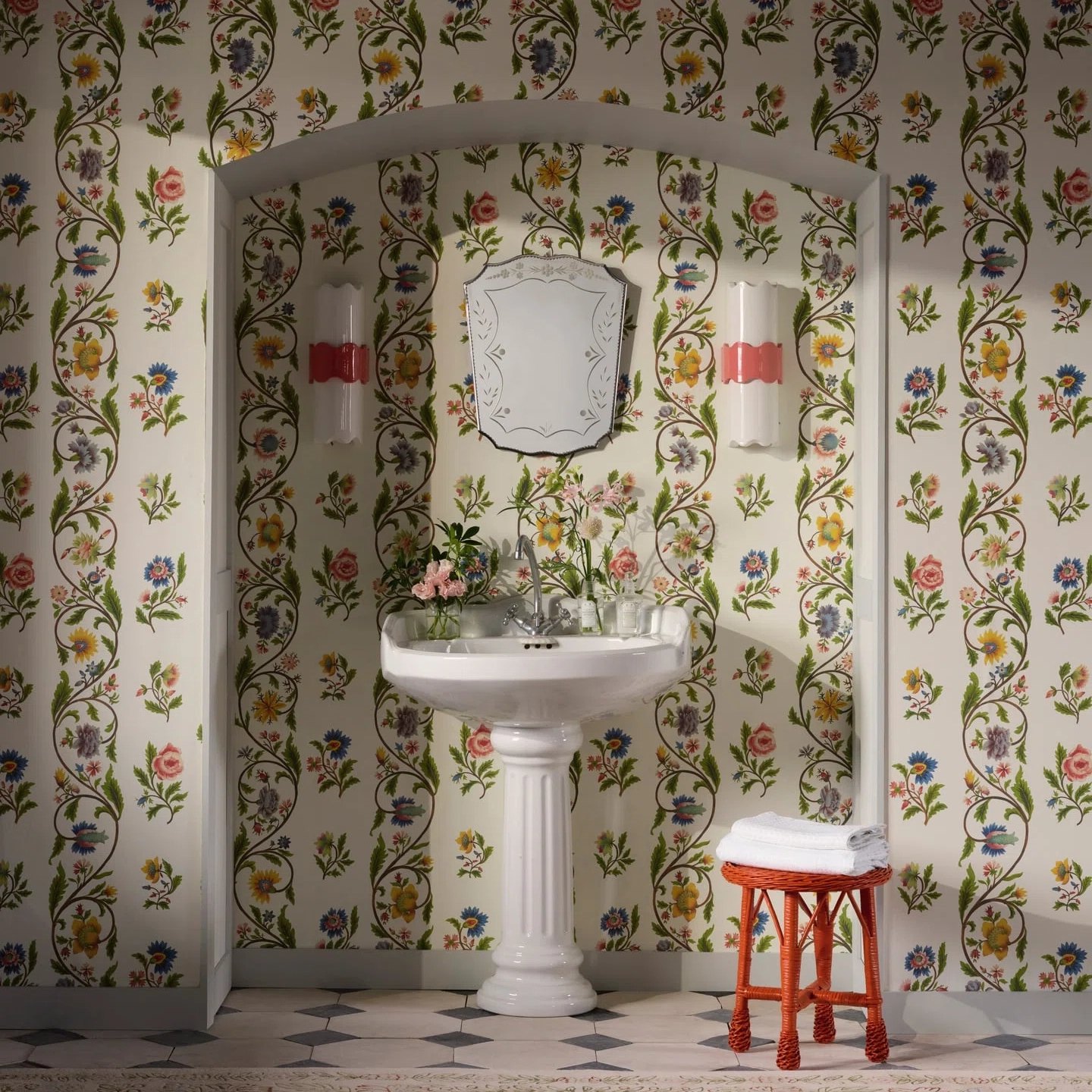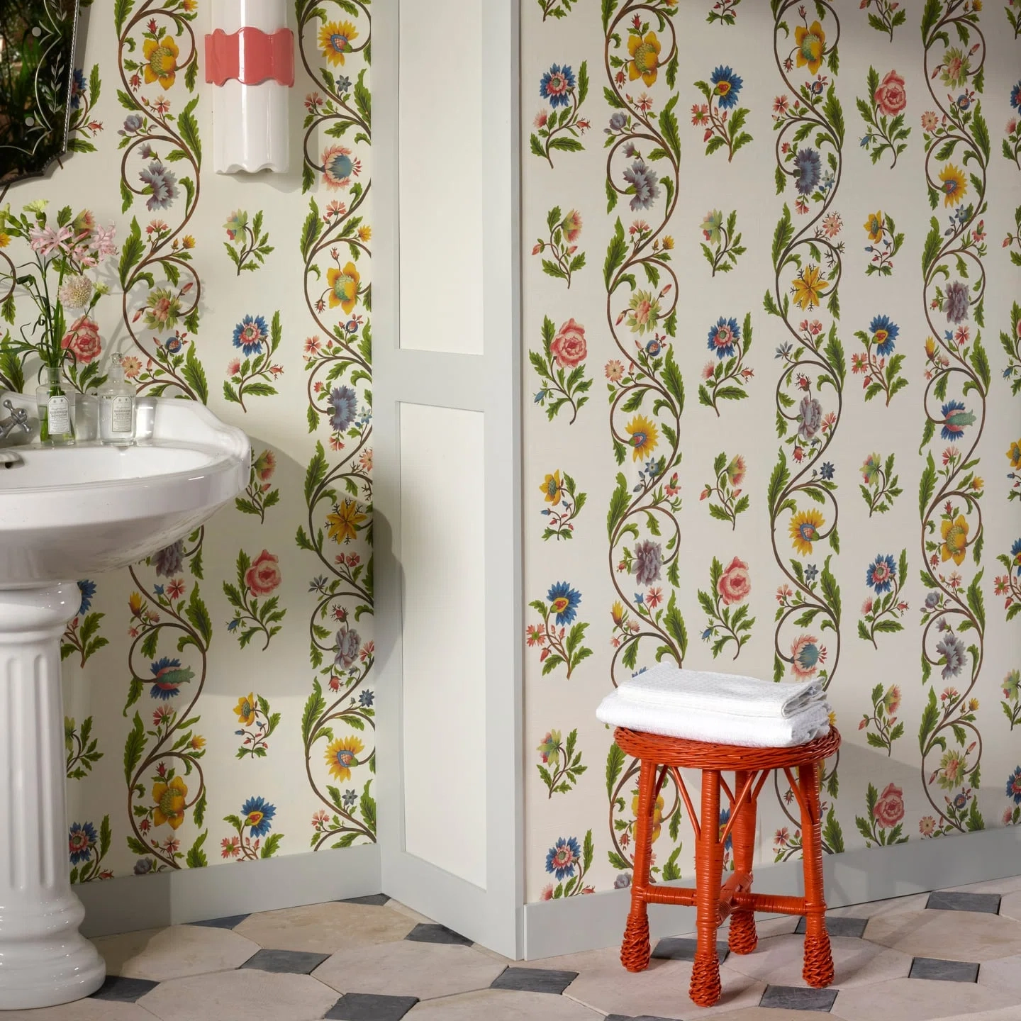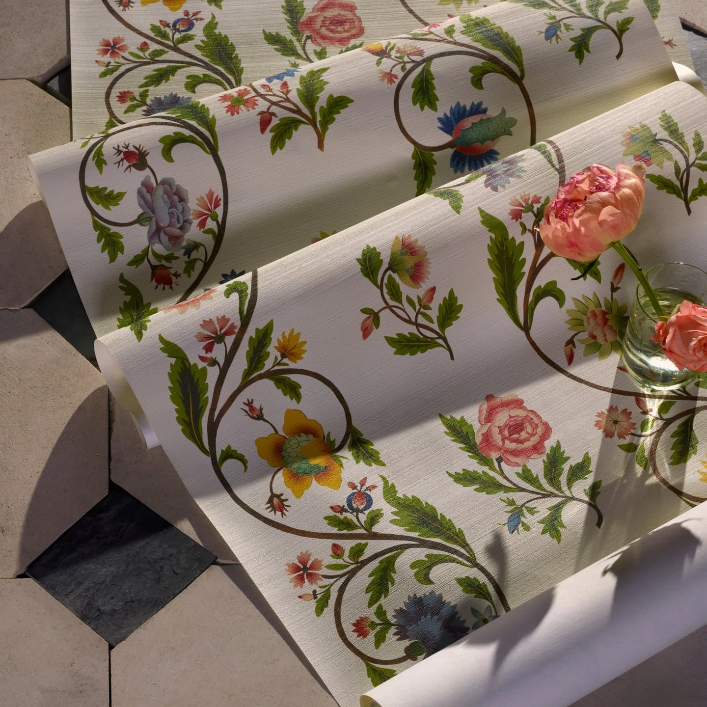 This motif, painted on silk and composed of delicate flowers — carnations, roses, or peonies — arranged in garlands and vertical bands, is preserved in the archives of Maison Pierre Frey. Reimagined as a charming floral stripe, printing on silk-embossed vinyl preserves its original elegance.