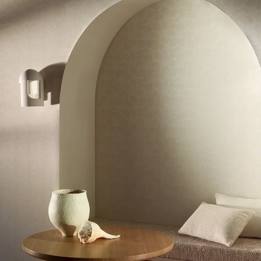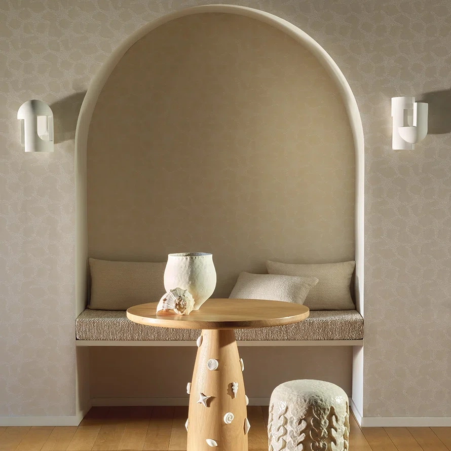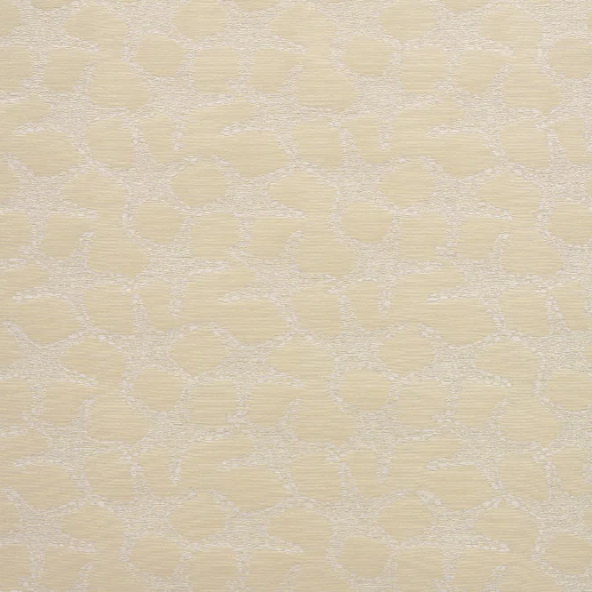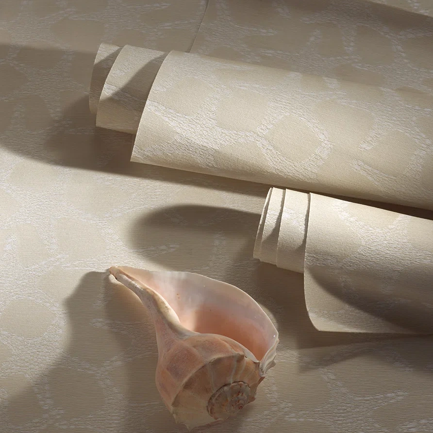The interplay of white and sand-colored raffia threads in this jacquard, backed on non-woven fabric, brings this charming seashell pattern to life.