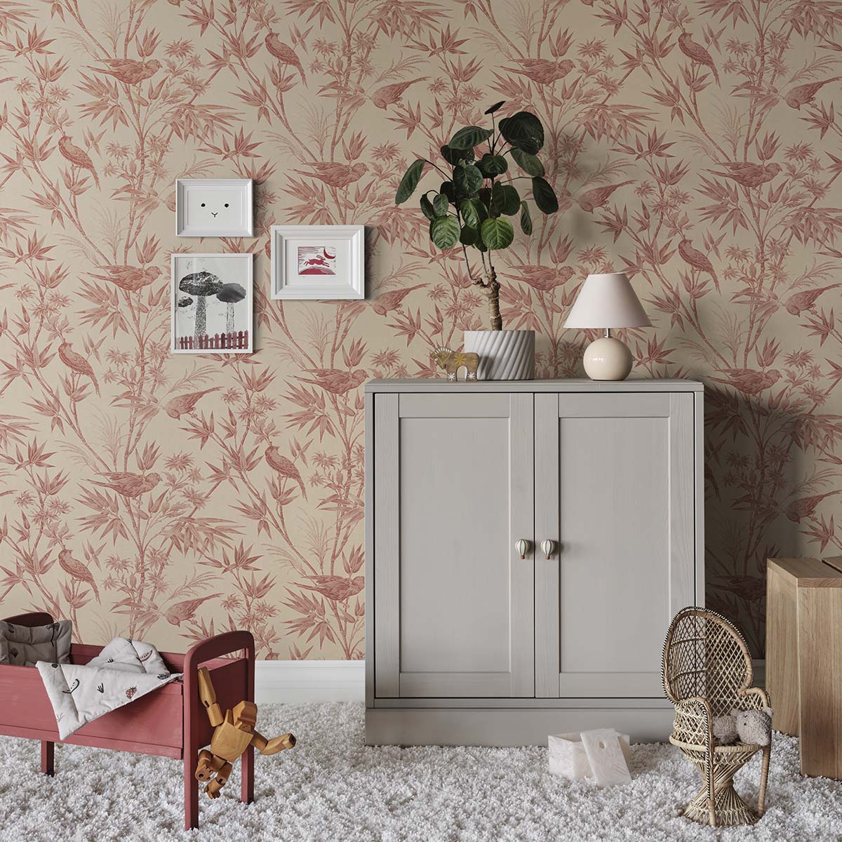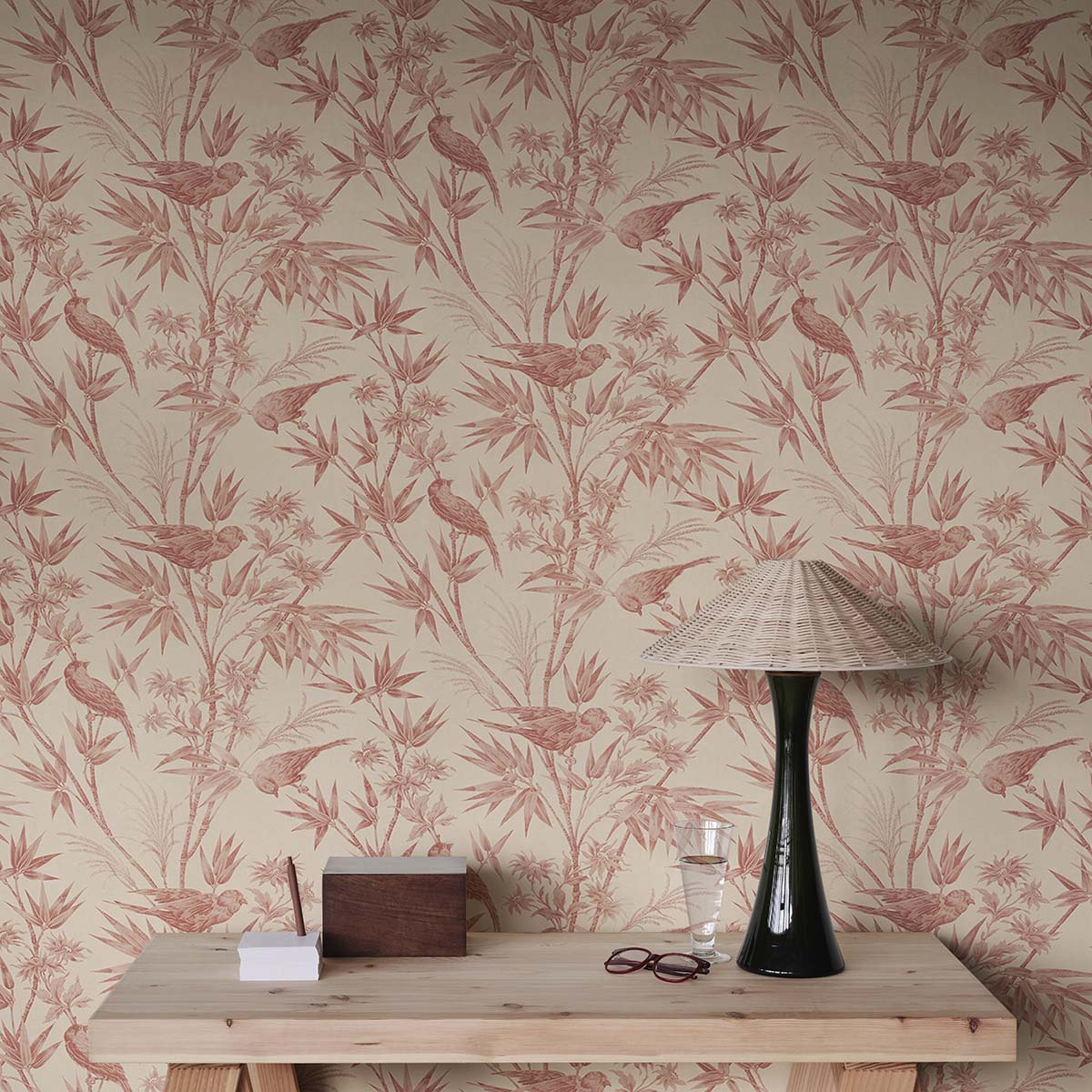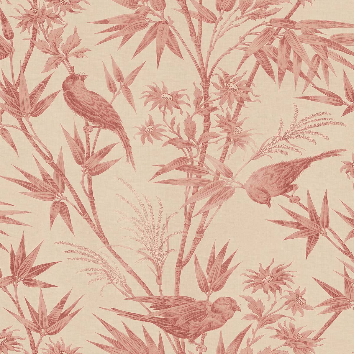 Embrace the classic toile charm of the Celeste wallpaper in a warm red palette. Its intricate design, featuring exotic birds perched among lush bamboo leaves and flowers, evokes a graceful elegance reminiscent of a timeless textile appearance. Perfect for adding subtle sophistication to any room. Designed by Studio Sandberg