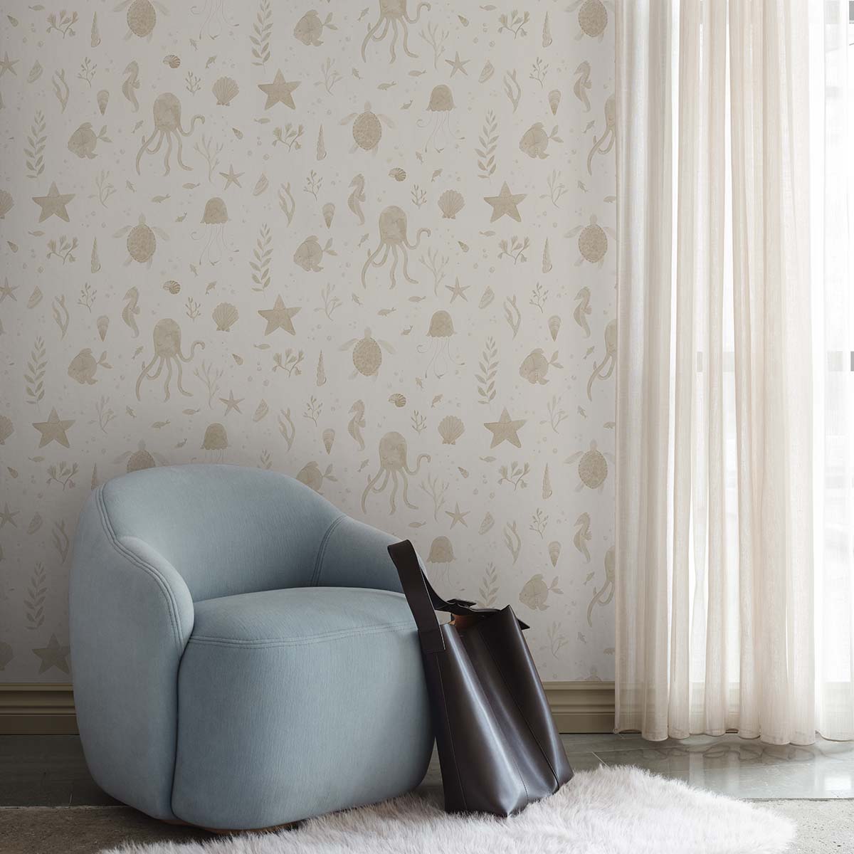 Invite whimsical marine life into your home with Della's enchanting underwater pattern. Featuring cute jellyfish, seahorses, turtles, and more, each creature is captured in soothing pink tones that fascinate both young and old. Perfect for sparking imagination and encouraging play in any room! Designed by Sara Bergqvist