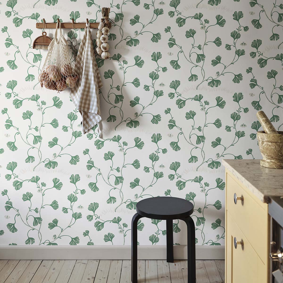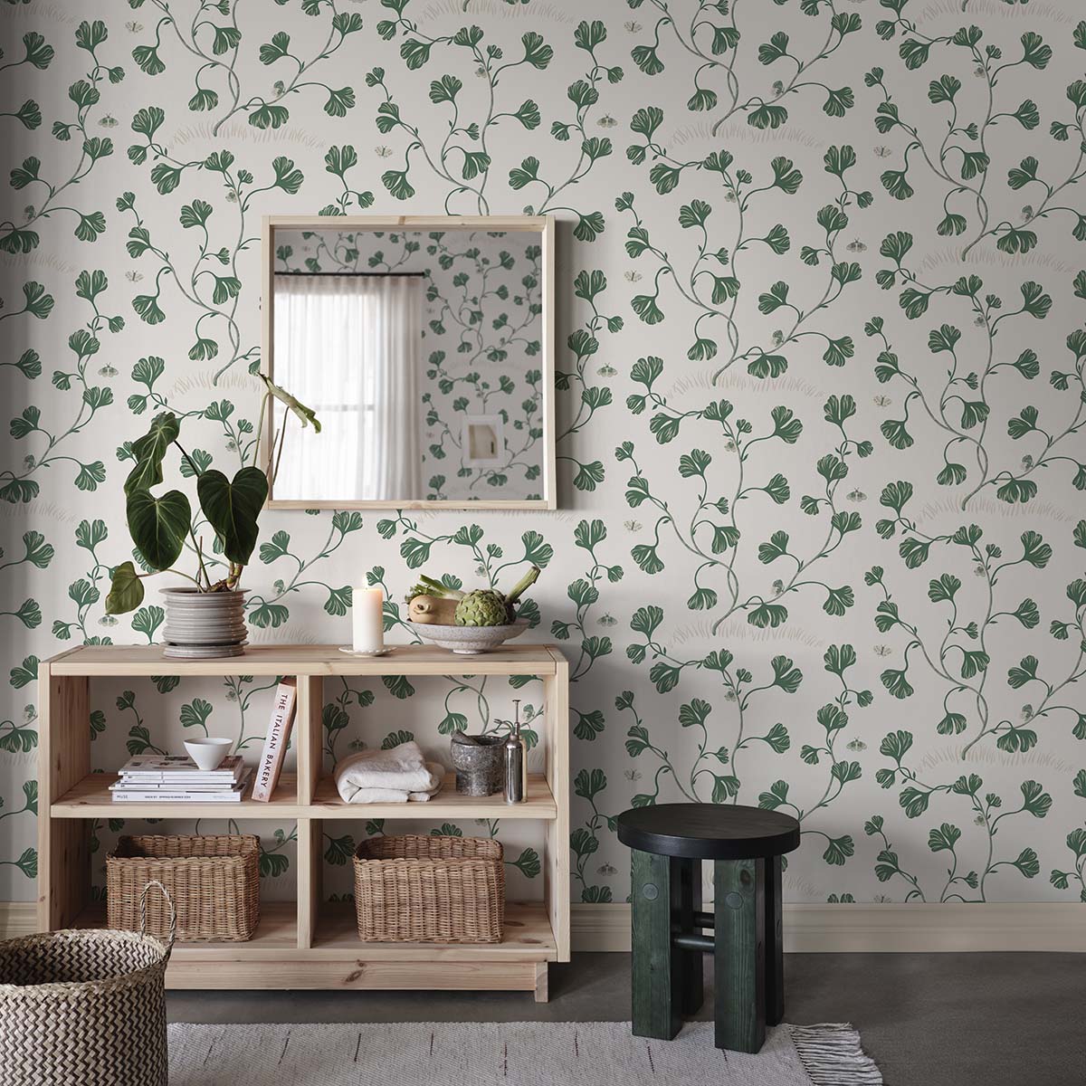 Winding ginkgo leaves dance gracefully alongside delicate butterflies, creating a serene botanical escape. The graphic simplicity and airy composition of Ebba enrich your space with elegance and charm. Perfect for those seeking a crisp and stylish expression in a home that celebrates nature’s quiet beauty. Designed by Sara Bergqvist