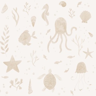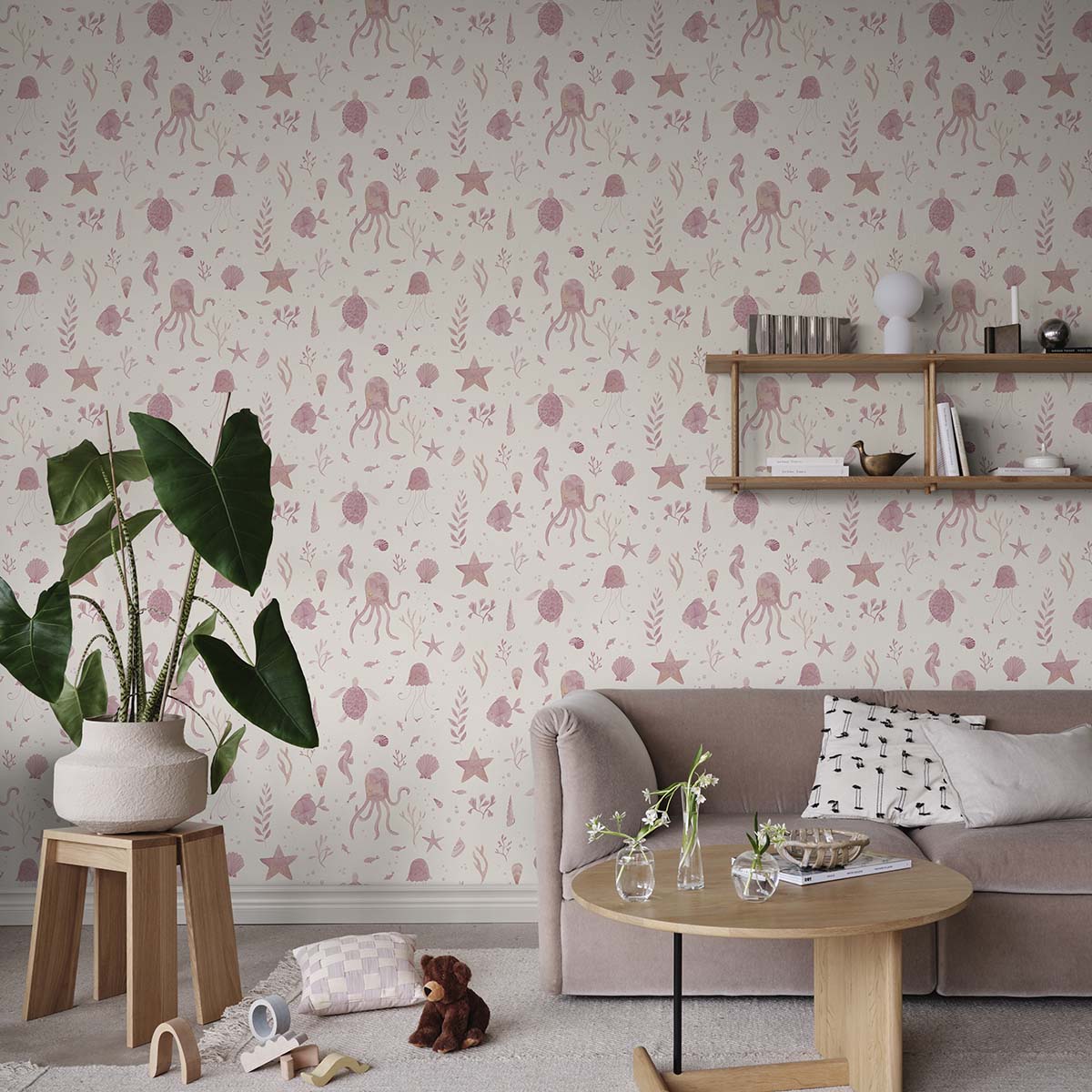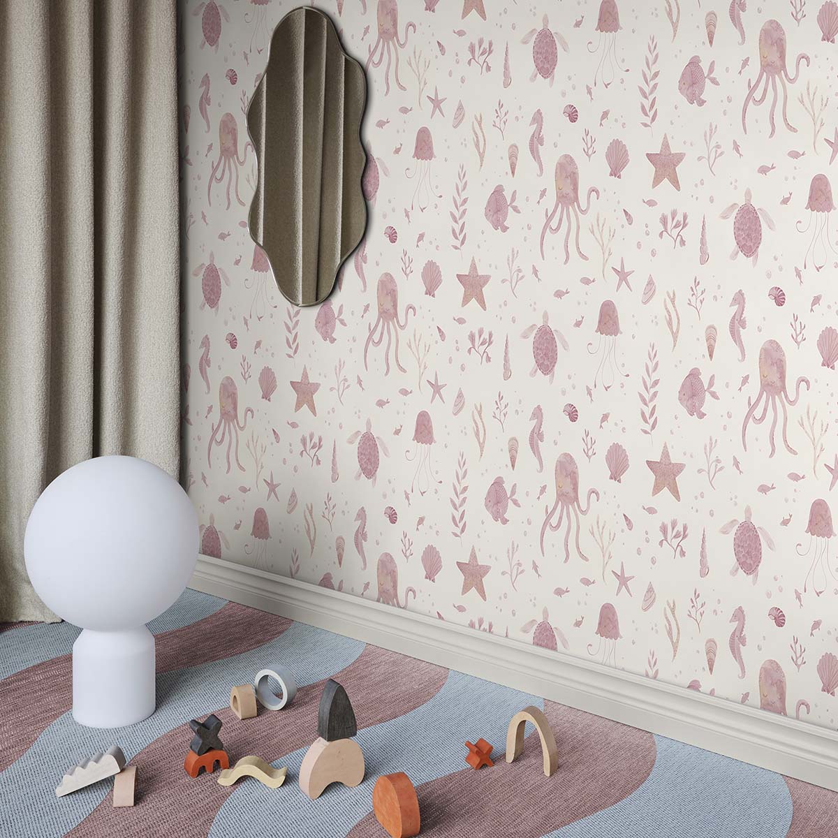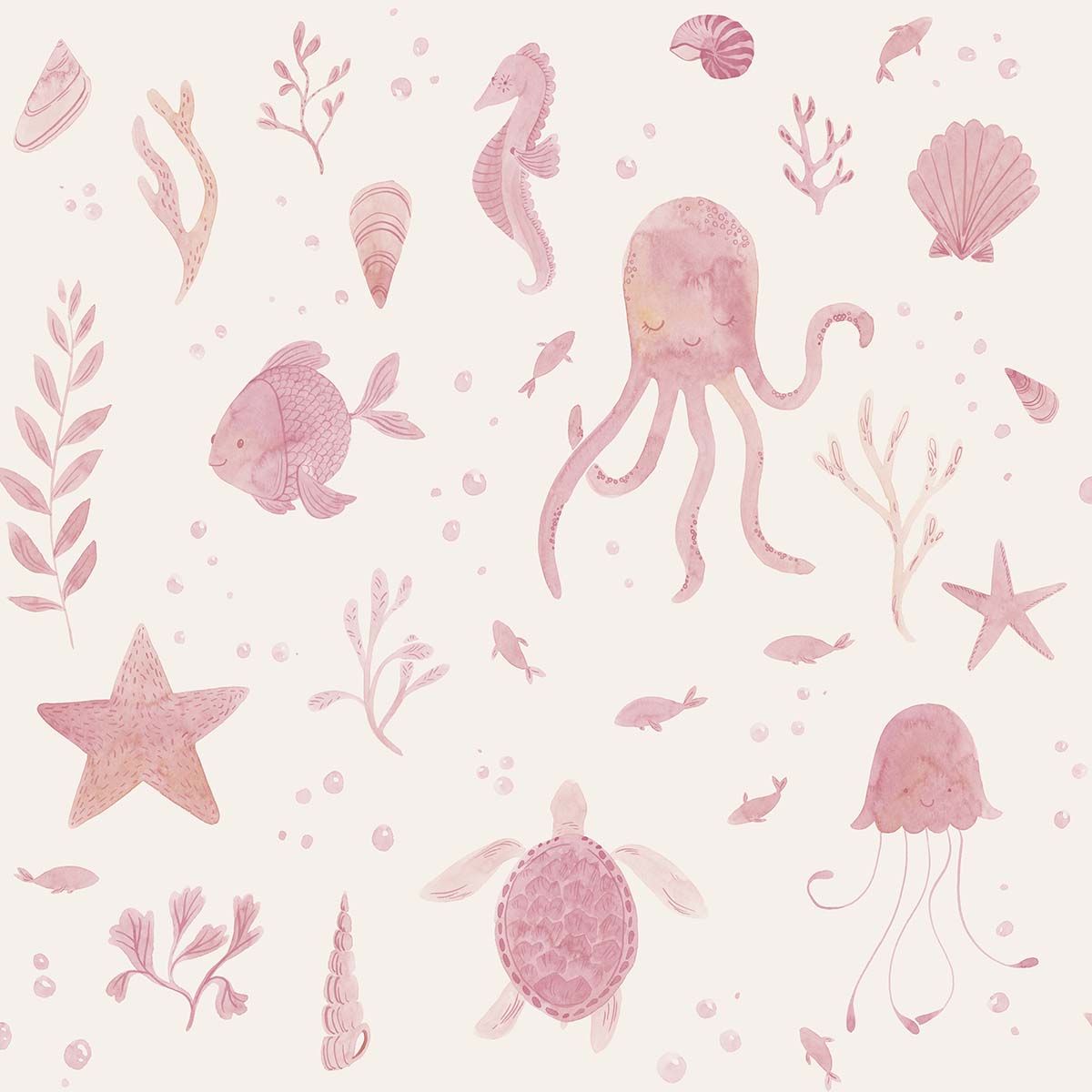 Invite whimsical marine life into your home with Della's enchanting underwater pattern. Featuring cute jellyfish, seahorses, turtles, and more, each creature is captured in soothing pink tones that fascinate both young and old. Perfect for sparking imagination and encouraging play in any room! Designed by Sara Bergqvist