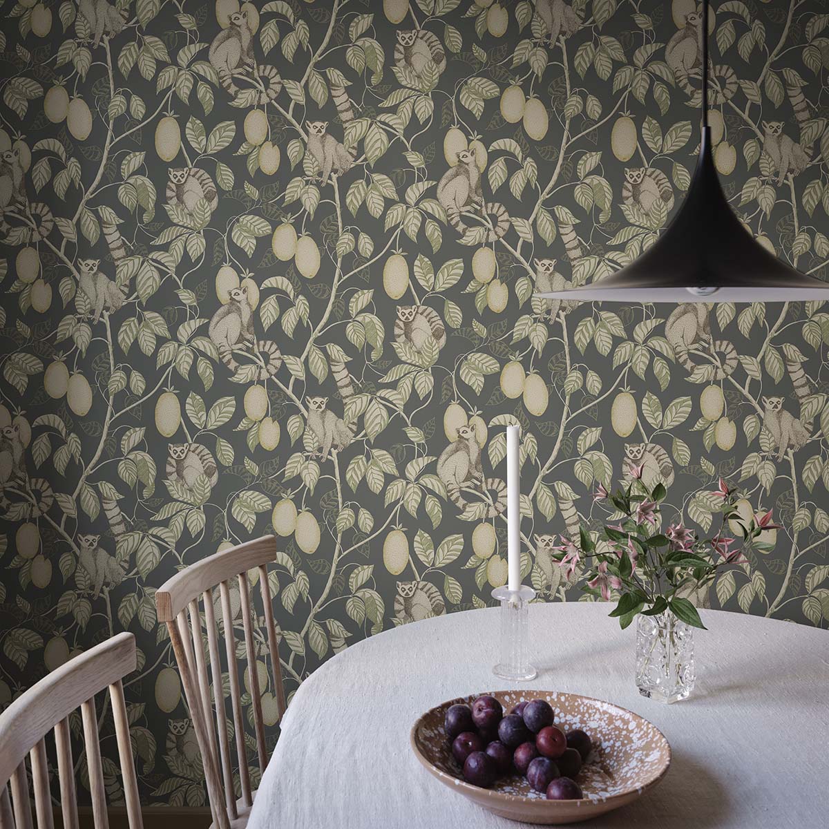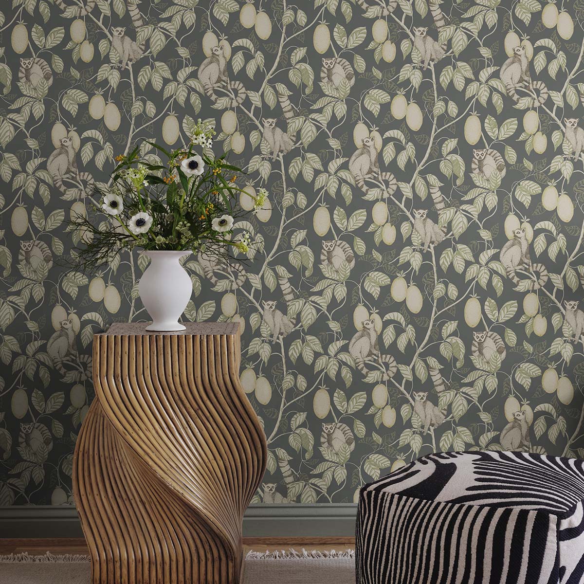 Lemurs peek playfully through the foliage in our Elliot wallpaper, bringing a soft exotic vibe to any room. This detailed pattern on a soothing light blue backdrop showcases curious lemurs camouflaged amongst lush leaves and fruits, making it a perfect fit for both children’s spaces and living rooms. Designed by Karolina Kroon
