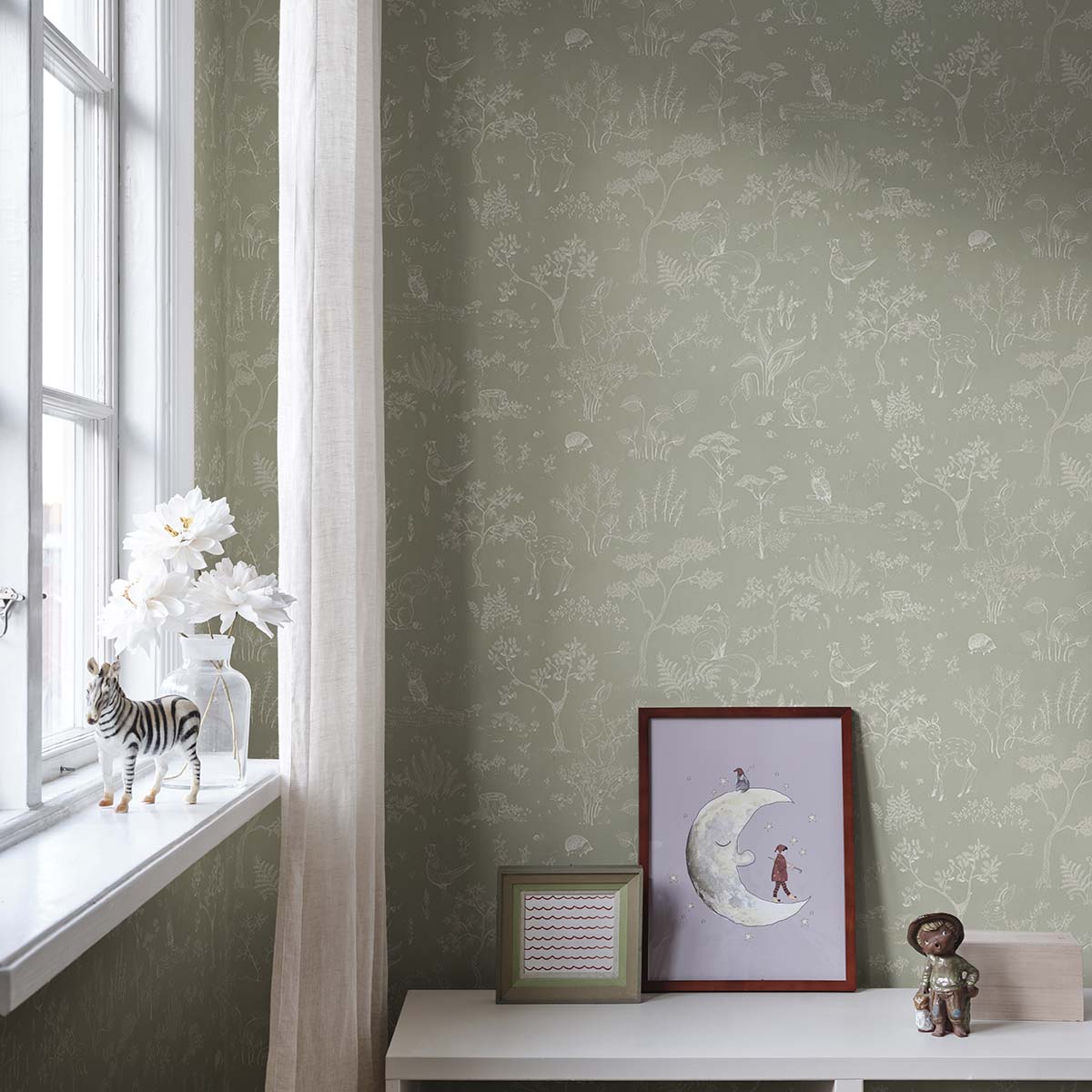 Hollie wallpaper invites you into a whimsical world, where charming forest creatures frolic amidst delicate botanical illustrations. With a soothing pistachio backdrop, this design brims with playful creativity and encourages imagination. Ideal for nurseries or any room in need of a touch of magic, the fine details and soft hues create a serene and inviting atmosphere. Designed by Sara Bergqvist