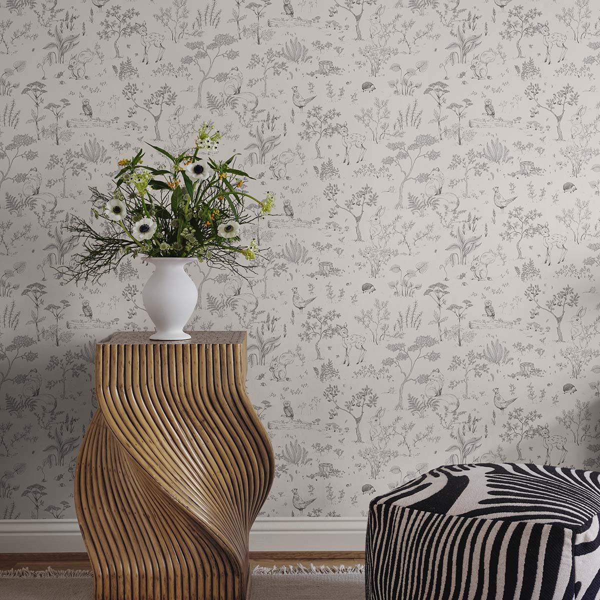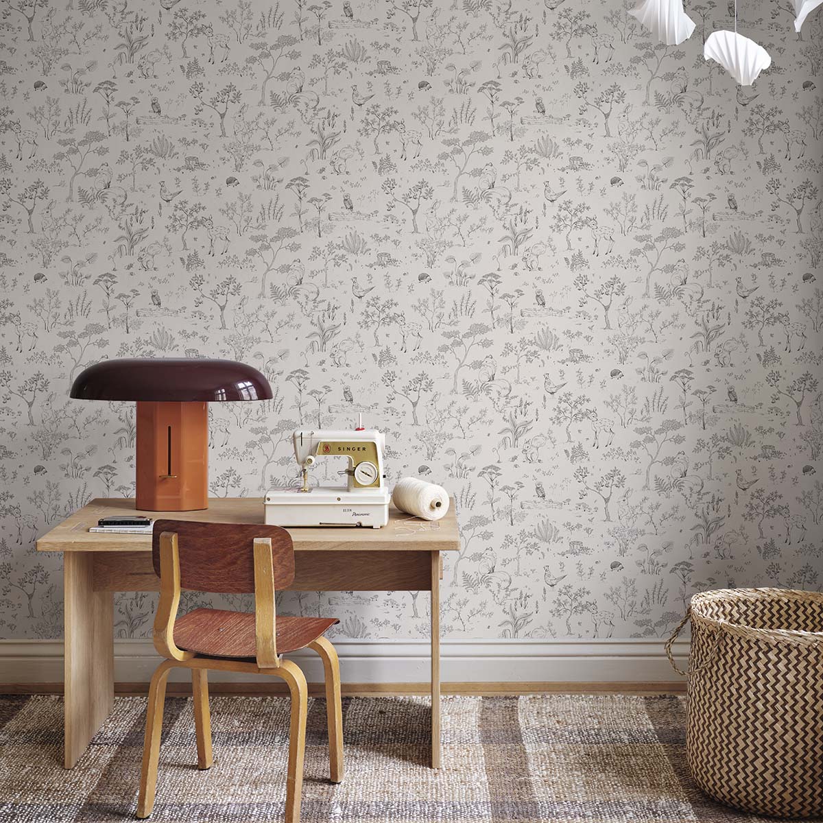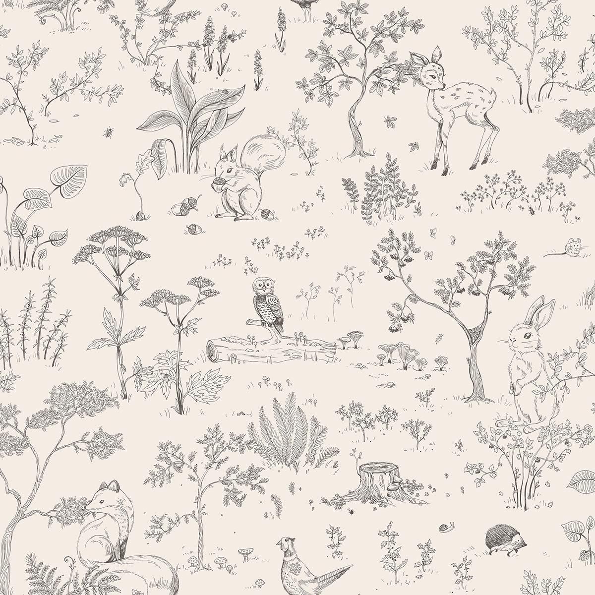 Hollie wallpaper invites you into a whimsical world, where charming forest creatures frolic amidst delicate botanical illustrations. With a soothing pistachio backdrop, this design brims with playful creativity and encourages imagination. Ideal for nurseries or any room in need of a touch of magic, the fine details and soft hues create a serene and inviting atmosphere. Designed by Sara Bergqvist