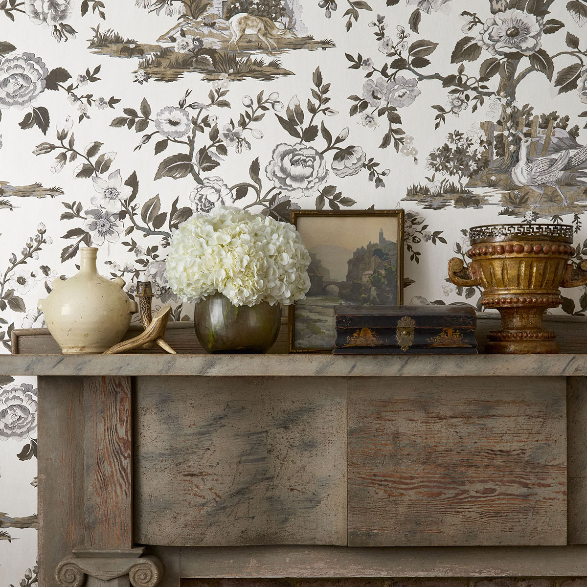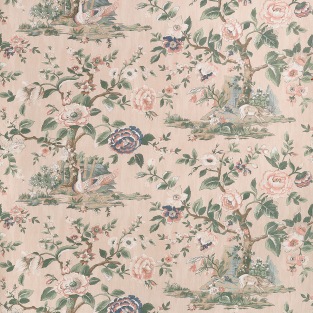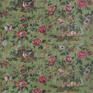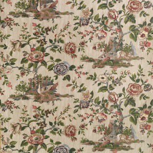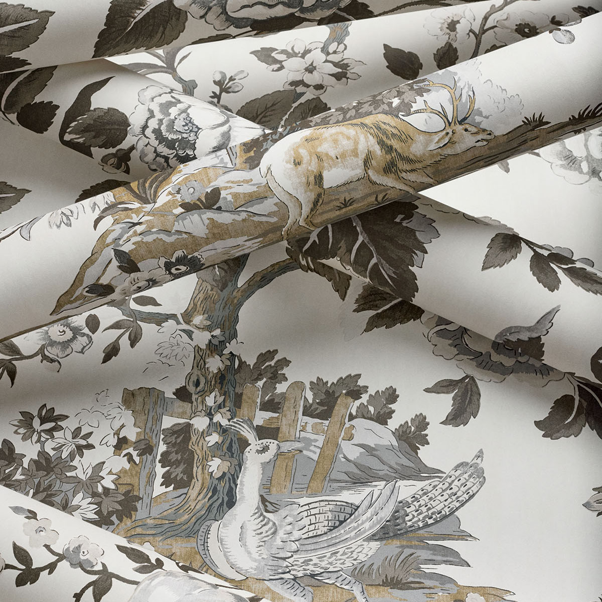 Capturing scenes from an English forest, this print was taken from an 1800s document. Deer pausing to drink from a pond and colorful pheasant set against large flowering trees, reimagined with new colors. The wallcovering and coordinating fabric comes in traditional olive green and cranberry to monochromatic beige and grey.