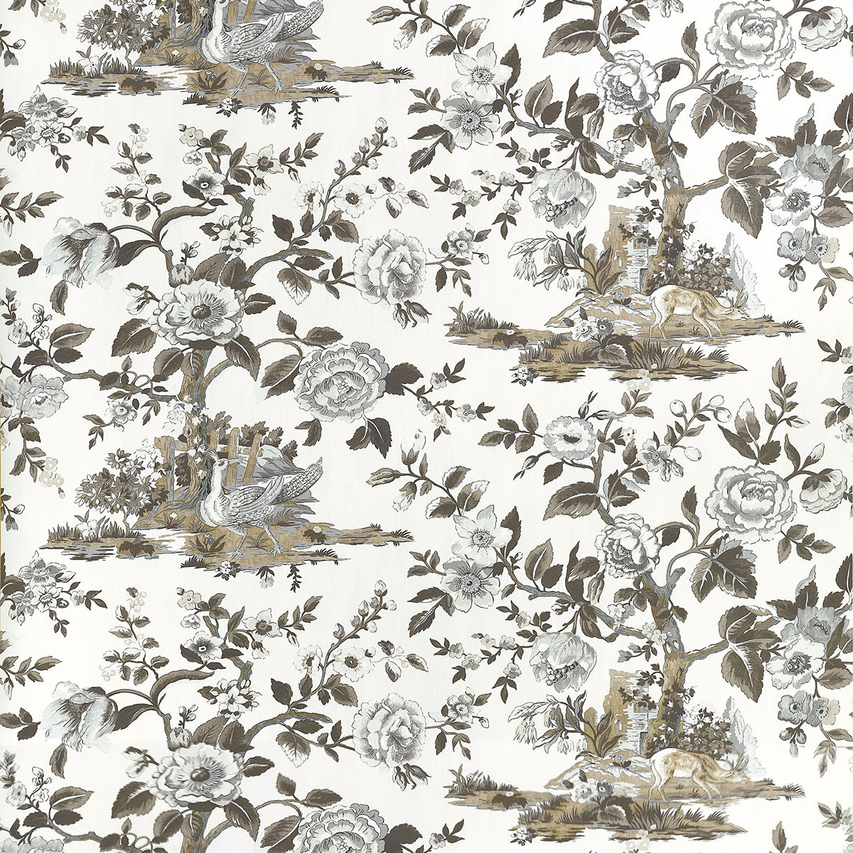 Capturing scenes from an English forest, this print was taken from an 1800s document. Deer pausing to drink from a pond and colorful pheasant set against large flowering trees, reimagined with new colors. The wallcovering and coordinating fabric comes in traditional olive green and cranberry to monochromatic beige and grey.